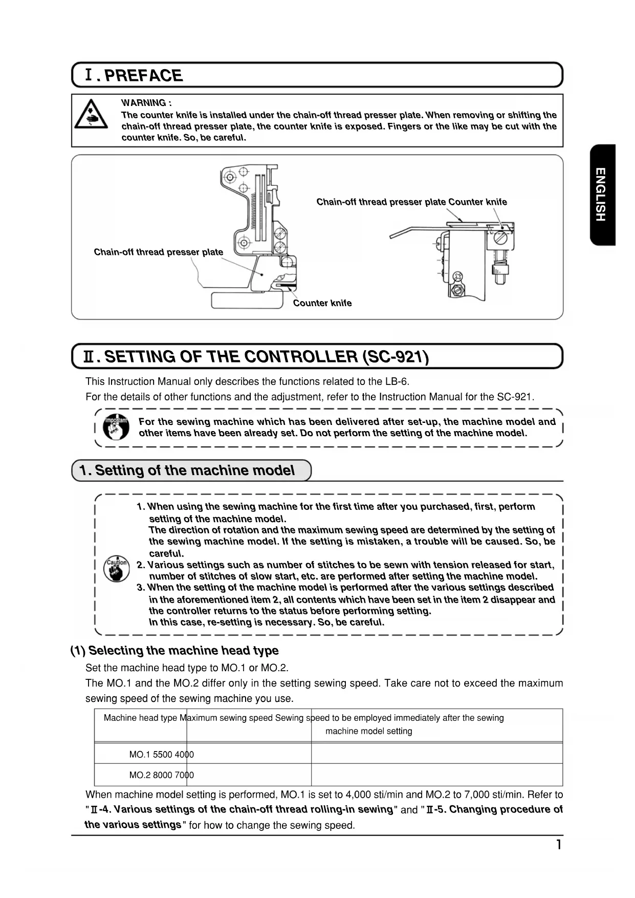 . PREFACE Chain-off thread presser plate Counter knifeWARNING :The counter knife is installed under the chain-off thread presser plate. When removing or shifting thechain-off thread presser plate, the counter knife is exposed. Fingers or the like may be cut with thecounter knife. So, be careful.Chain-off thread presser plateCounter knifeWhen machine model setting is performed, MO.1 is set to 4,000 sti/min and MO.2 to 7,000 sti/min. Refer to"@-4. Various settings of the chain-off thread rolling-in sewing" and "@-5. Changing procedure ofthe various settings" for how to change the sewing speed.2 How to change over to the function setting mode