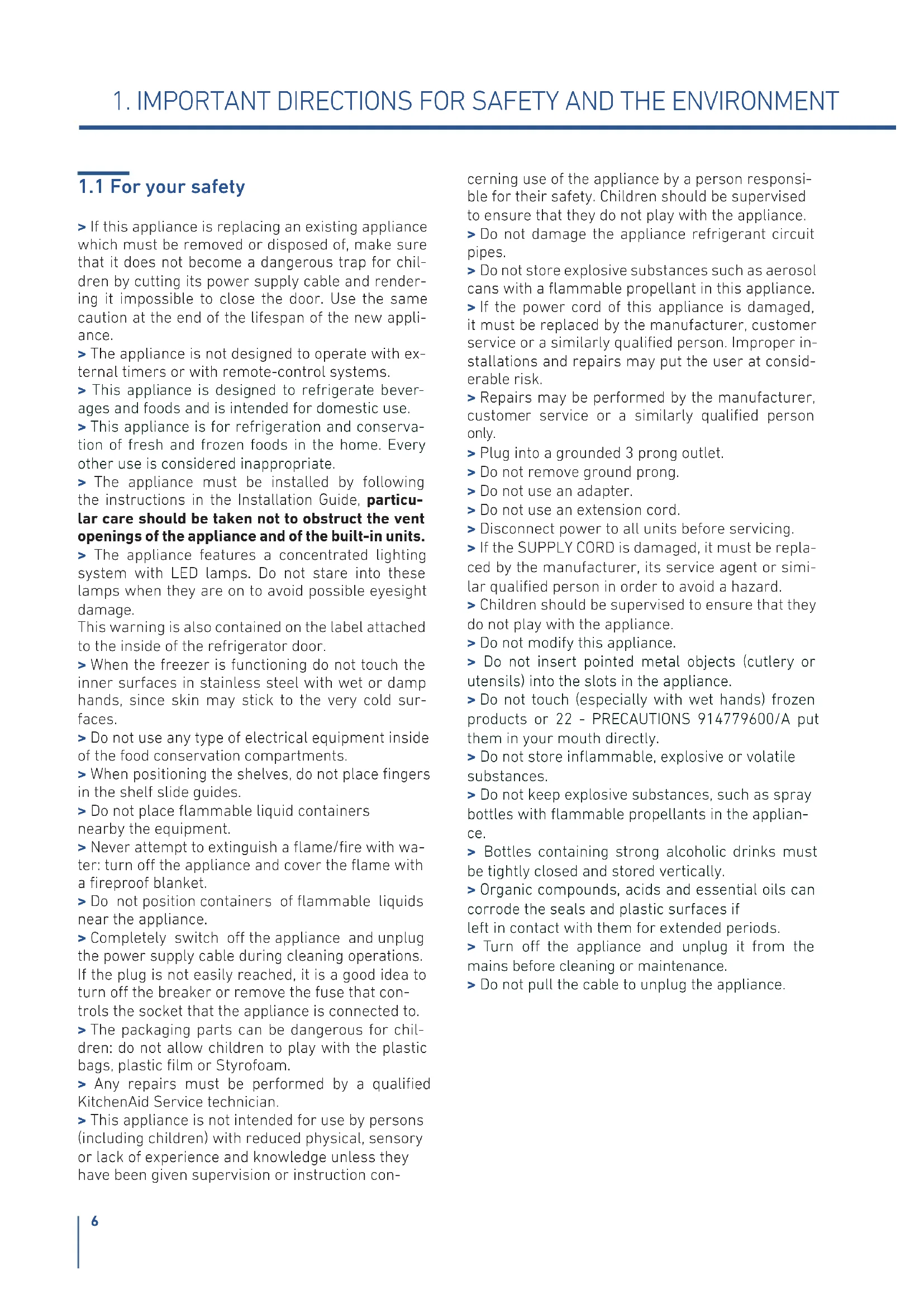 > If this appliance is replacing an existing appliance which must be removed or disposed of, make sure that it does not become a dangerous trap for chil- dren by cutting its power supply cable and render- ing it impossible to close the door. Use the same caution at the end of the lifespan of the new appli- ance. > The appliance is not designed to operate with ex- ternal timers or with remote-control systems. > This appliance is designed to refrigerate bever- ages and foods and is intended for domestic use. > This appliance is for refrigeration and conserva- tion of fresh and frozen foods in the home. Every other use is considered inappropriate. > The appliance must be installed by following the instructions in the Installation Guide, particu- lar care should be taken not to obstruct the vent openings of the appliance and of the built-in units. > The appliance features a concentrated lighting system with LED lamps. Do not stare into these lamps when they are on to avoid possible eyesight damage. This warning is also contained on the label attached to the inside of the refrigerator door. > When the freezer is functioning do not touch the inner surfaces in stainless steel with wet or damp hands, since skin may stick to the very cold sur- faces. > Do not use any type of electrical equipment inside of the food conservation compartments. > When positioning the shelves, do not place ngers in the shelf slide guides. > Do not place ammable liquid containers nearby the equipment. > Never attempt to extinguish a ame/re with wa- ter: turn o the appliance and cover the ame with a reproof blanket. > Do not position containers of ammable liquids near the appliance. > Completely switch o the appliance and unplug the power supply cable during cleaning operations. If the plug is not easily reached, it is a good idea to turn o the breaker or remove the fuse that con- trols the socket that the appliance is connected to. > The packaging parts can be dangerous for chil- dren: do not allow children to play with the plastic bags, plastic lm or Styrofoam. > Any repairs must be performed by a qualied KitchenAid Service technician. > This appliance is not intended for use by persons (including children) with reduced physical, sensory or lack of experience and knowledge unless they have been given supervision or instruction con- cerning use of the appliance by a person responsi- ble for their safety. Children should be supervised to ensure that they do not play with the appliance. > Do not damage the appliance refrigerant circuit pipes. > Do not store explosive substances such as aerosol cans with a ammable propellant in this appliance. > If the power cord of this appliance is damaged, it must be replaced by the manufacturer, customer service or a similarly qualied person. Improper in- stallations and repairs may put the user at consid- erable risk. > Repairs may be performed by the manufacturer, customer service or a similarly qualied person only. > Plug into a grounded 3 prong outlet. > Do not remove ground prong. > Do not use an adapter. > Do not use an extension cord. > Disconnect power to all units before servicing. > If the SUPPLY CORD is damaged, it must be repla- ced by the manufacturer, its service agent or simi- lar qualied person in order to avoid a hazard. > Children should be supervised to ensure that they do not play with the appliance. > Do not modify this appliance. > Do not insert pointed metal objects (cutlery or utensils) into the slots in the appliance. > Do not touch (especially with wet hands) frozen products or 22 - PRECAUTIONS 914779600/A put them in your mouth directly. > Do not store inammable, explosive or volatile substances. > Do not keep explosive substances, such as spray bottles with ammable propellants in the applian- ce. > Bottles containing strong alcoholic drinks must be tightly closed and stored vertically. > Organic compounds, acids and essential oils can corrode the seals and plastic surfaces if left in contact with them for extended periods. > Turn o the appliance and unplug it from the mains before cleaning or maintenance. > Do not pull the cable to unplug the appliance.