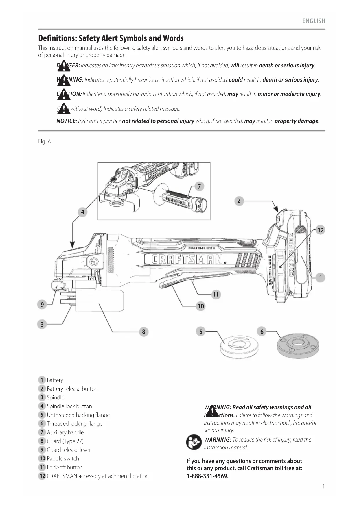 offered by CRAFTSMAN, have not been tested with this product, use of such accessories with this tool could be hazardous. To reduce the risk of injury, only CRAFTSMAN recommended accessories should be used with thisproduct. Recommended accessories for use with your tool are available at extra cost from your local dealer or authorized service center. If you need assistance in locating any accessory, please contact CRAFTSMAN call 1‑888‑331‑4569.ENGLISH