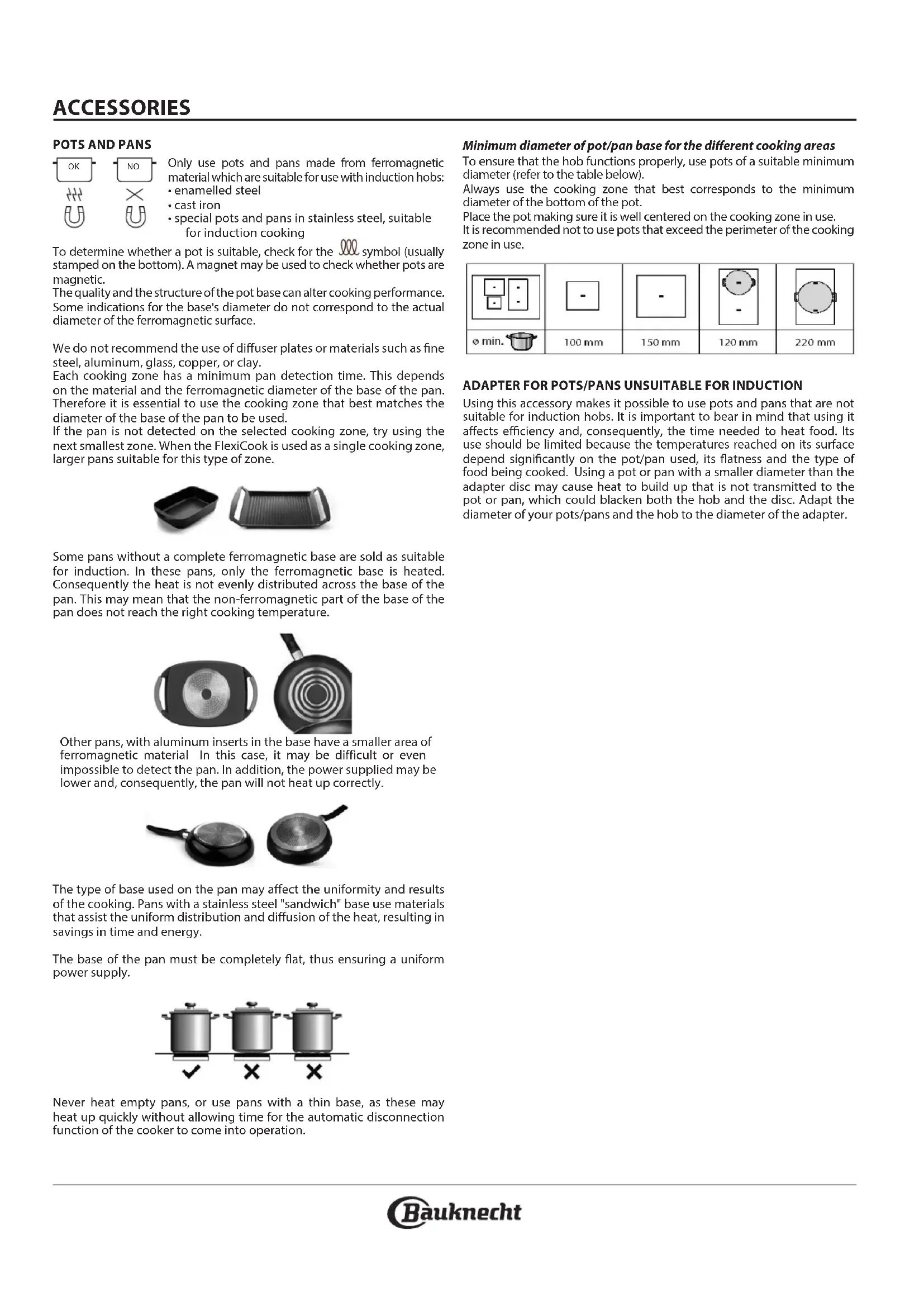 - special pots and pans in stainless steel, suitable for induction cooking To determine whether a pot is suitable, check for the symbol (usually stamped on the bottom). A magnet may be used to check whether pots are magnetic. The quality and the structure of the pot base can alter cooking performance. Some indications for the base's diameter do not correspond to the actual diameter of the ferromagnetic surface. We do not recommend the use of diuser plates or materials such as ne steel, aluminum, glass, copper, or clay. Each cooking zone has a minimum pan detection time. This depends on the material and the ferromagnetic diameter of the base of the pan. Therefore it is essential to use the cooking zone that best matches the diameter of the base of the pan to be used. If the pan is not detected on the selected cooking zone, try using the next smallest zone. When the FlexiCook is used as a single cooking zone, larger pans suitable for this type of zone. Some pans without a complete ferromagnetic base are sold as suitable for induction. In these pans, only the ferromagnetic base is heated. Consequently the heat is not evenly distributed across the base of the pan. This may mean that the non-ferromagnetic part of the base of the pan does not reach the right cooking temperature. Other pans, with aluminum inserts in the base have a smaller area of ferromagnetic material In this case, it may be difficult or even impossible to detect the pan. In addition, the power supplied may be lower and, consequently, the pan will not heat up correctly. The type of base used on the pan may aect the uniformity and results of the cooking. Pans with a stainless steel "sandwich" base use materials that assist the uniform distribution and diusion of the heat, resulting in savings in time and energy. The base of the pan must be completely at, thus ensuring a uniform power supply. Never heat empty pans, or use pans with a thin base, as these may heat up quickly without allowing time for the automatic disconnection function of the cooker to come into operation. NOOK Minimum diameter of pot/pan base for the dierent cooking areas To ensure that the hob functions properly, use pots of a suitable minimum diameter (refer to the table below). Always use the cooking zone that best corresponds to the minimum diameter of the bottom of the pot. Place the pot making sure it is well centered on the cooking zone in use. It is recommended not to use pots that exceed the perimeter of the cooking zone in use. ADAPTER FOR POTS/PANS UNSUITABLE FOR INDUCTION Using this accessory makes it possible to use pots and pans that are not suitable for induction hobs. It is important to bear in mind that using it aects eciency and, consequently, the time needed to heat food. Its use should be limited because the temperatures reached on its surface depend signicantly on the pot/pan used, its atness and the type of food being cooked. Using a pot or pan with a smaller diameter than the adapter disc may cause heat to build up that is not transmitted to the pot or pan, which could blacken both the hob and the disc. Adapt the diameter of your pots/pans and the hob to the diameter of the adapter.FIRST TIME USE