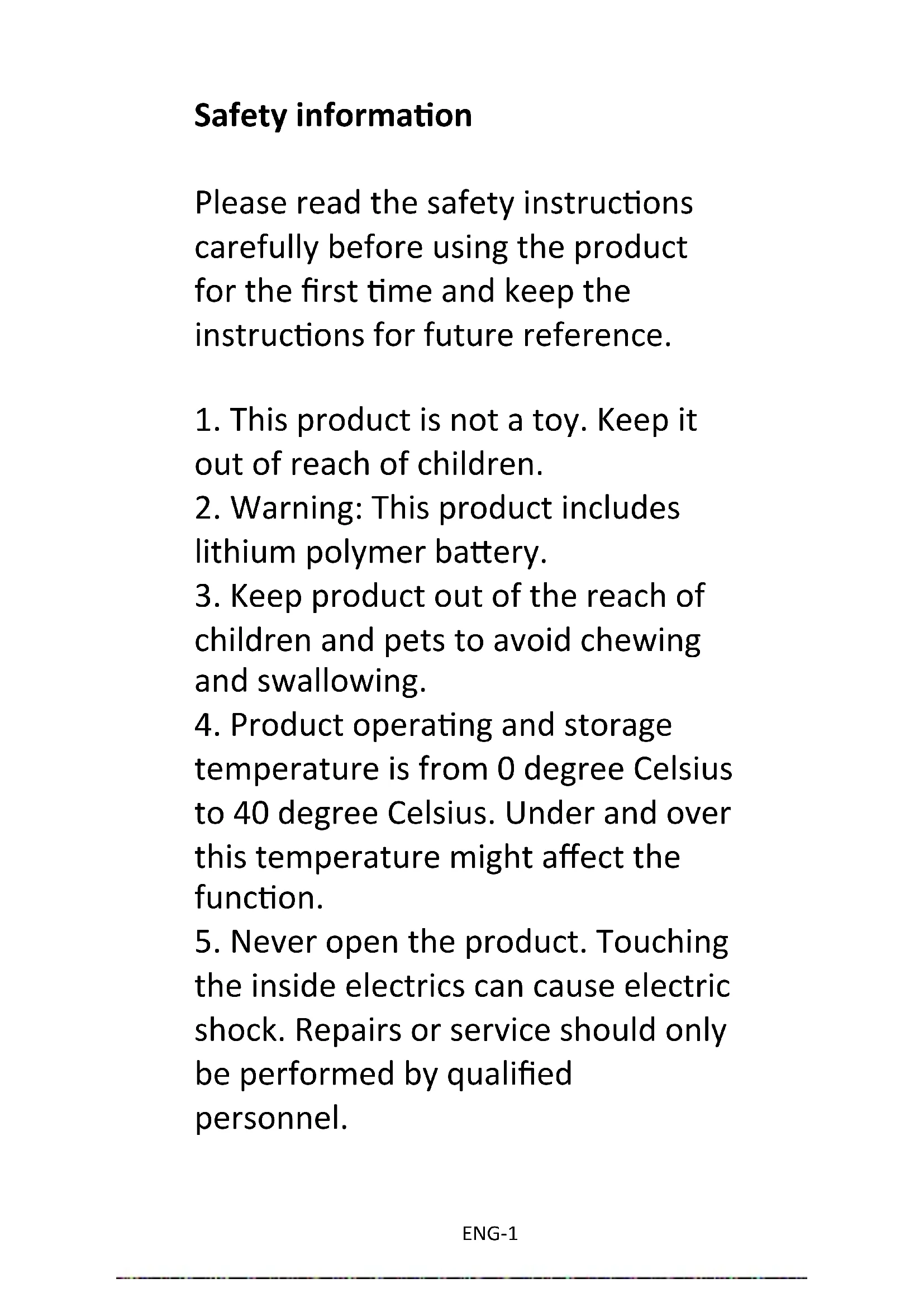 the inside electrics can cause electric shock. Repairs or service should only be performed by qualified personnel.ENG-2