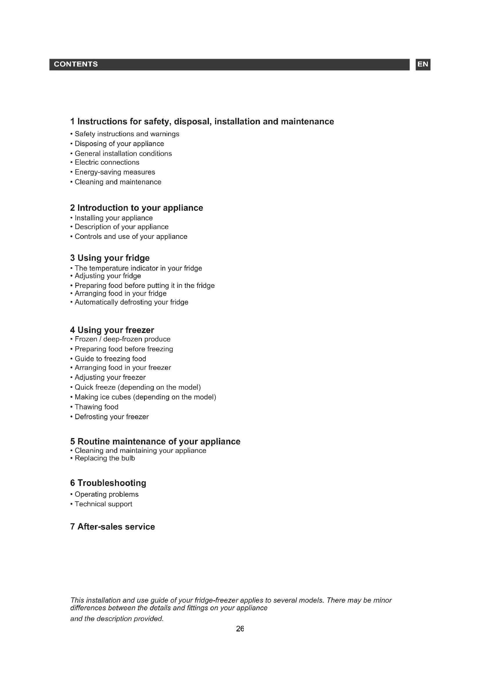 This installation and use guide of your fridge-freezer applies to several models. There may be minor differences between the details and fittings on your appliance and the description provided. 26This appliance complies with the European directives. SAFETY GUIDELINES For your safety and in order to use your appliance correctly, carefully read these instructions (including the warnings and useful advice), before installation and first use. To avoid damaging the appliance and unnecessary injury, it is important that the persons who use the appliance fully understand how it works and the safety instructions. Always keep these instructions close to the appliance so that they can accompany it in the event of resale or a change of house. In this way, the appliance will continue to function optimally and any risk of injury will be avoided. The manufacturer shall not be held liable in the event of misuse of the appliance.