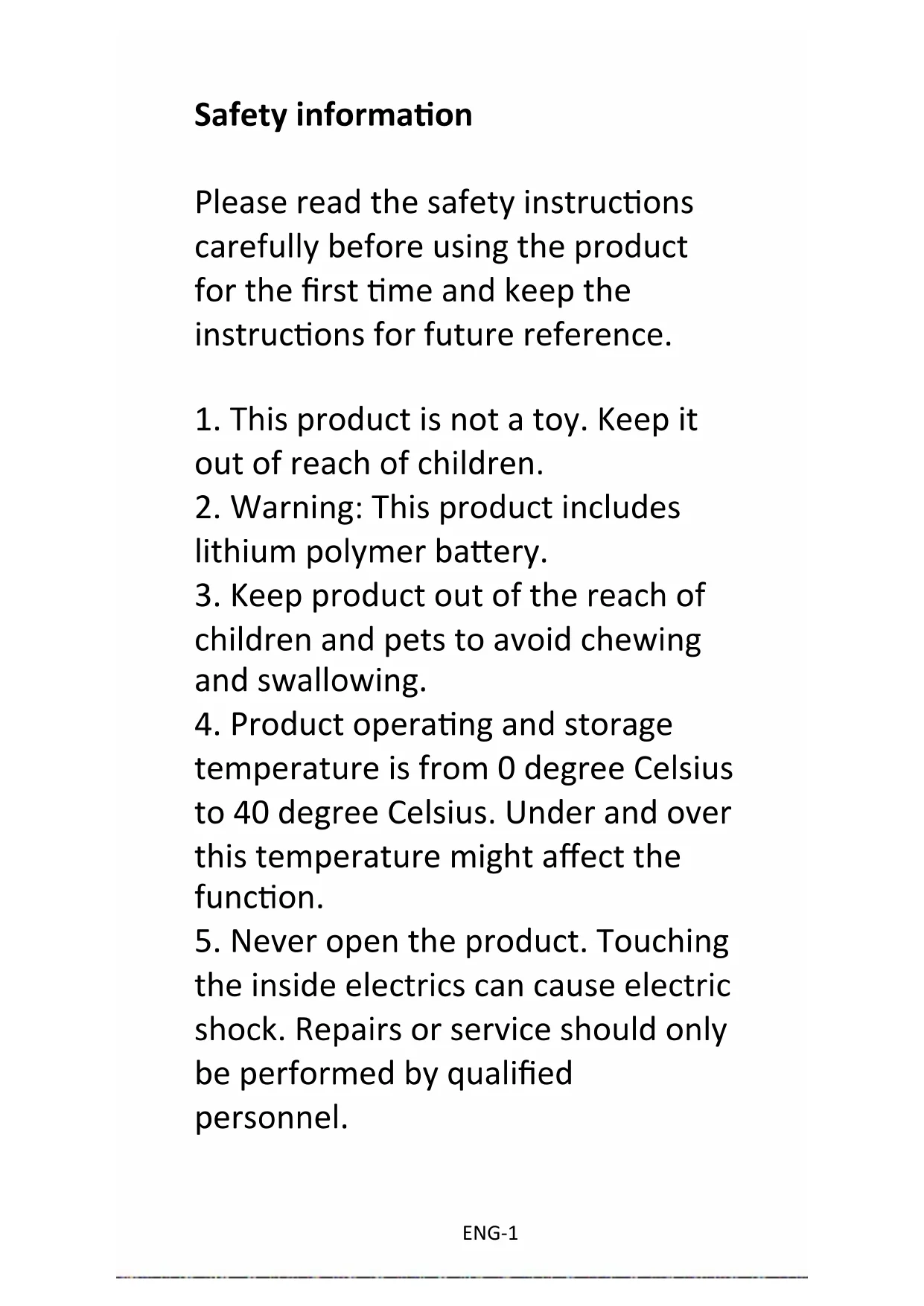 the inside electrics can cause electric shock. Repairs or service should only be performed by qualified personnel.ENG-2
