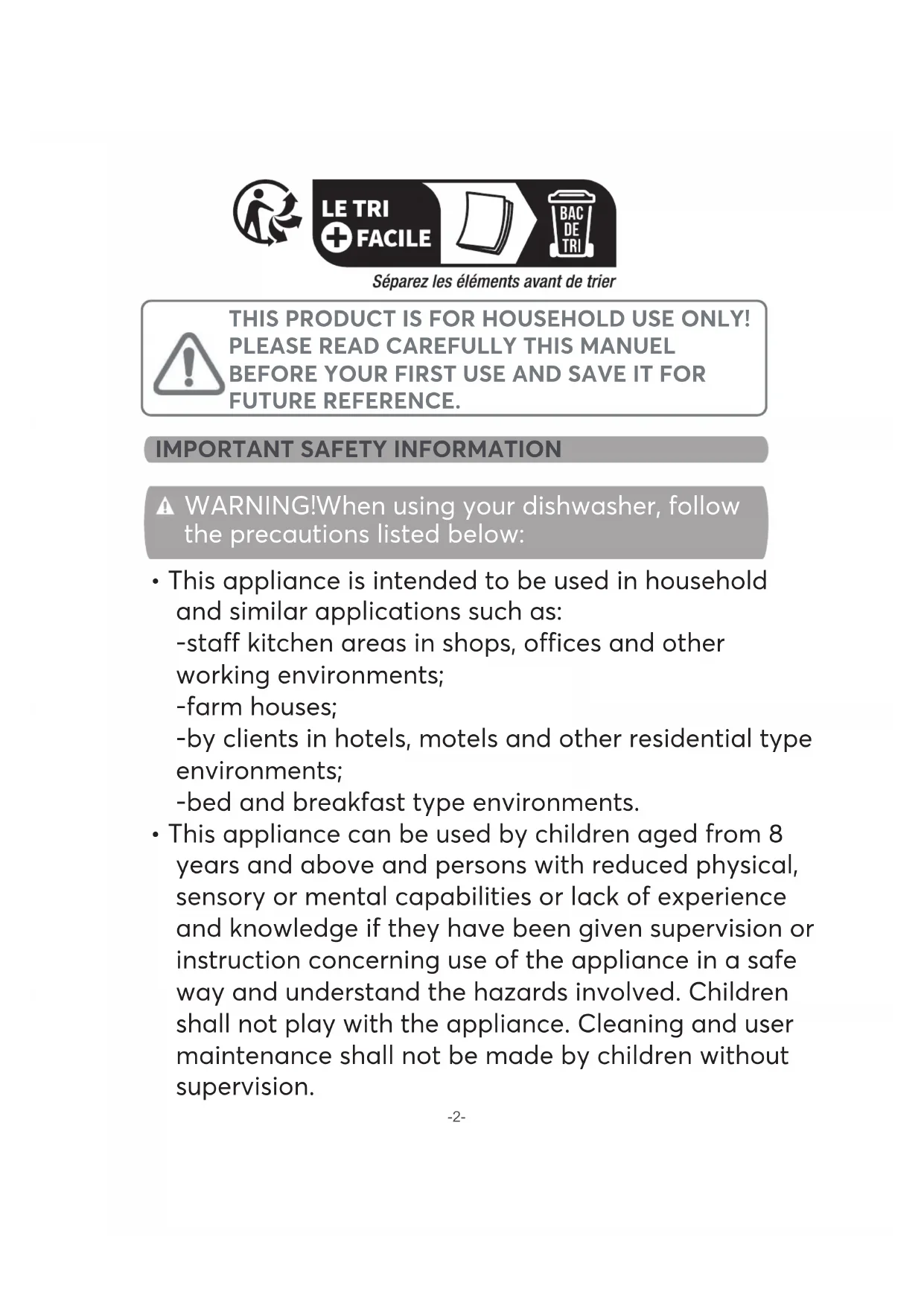 Important safety information Product overview Using your dishwasher Loading the baskets Maintenance and cleaning Installation instruction Program selection Troubleshooting tips Error codes Technical information Correct disposal of this product- 2 - WARNING! the precautions listed below: When using your dishwasher, follow THIS PRODUCT IS FOR HOUSEHOLD USE ONLY!