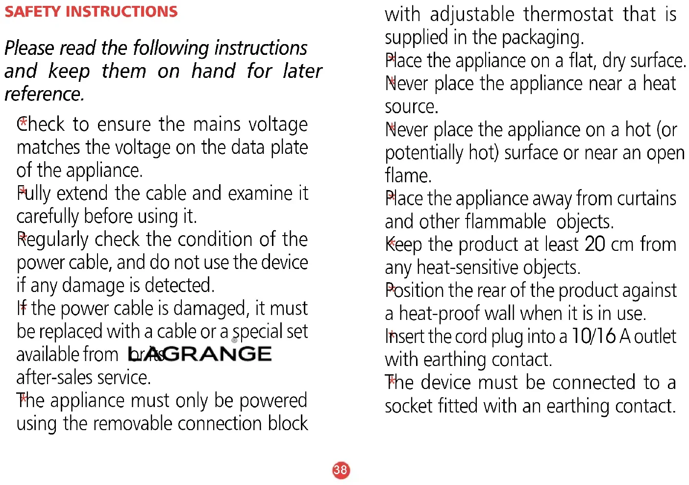 The appliance must only be powered using the removable connection block with adjustable thermostat that is supplied in the packaging.