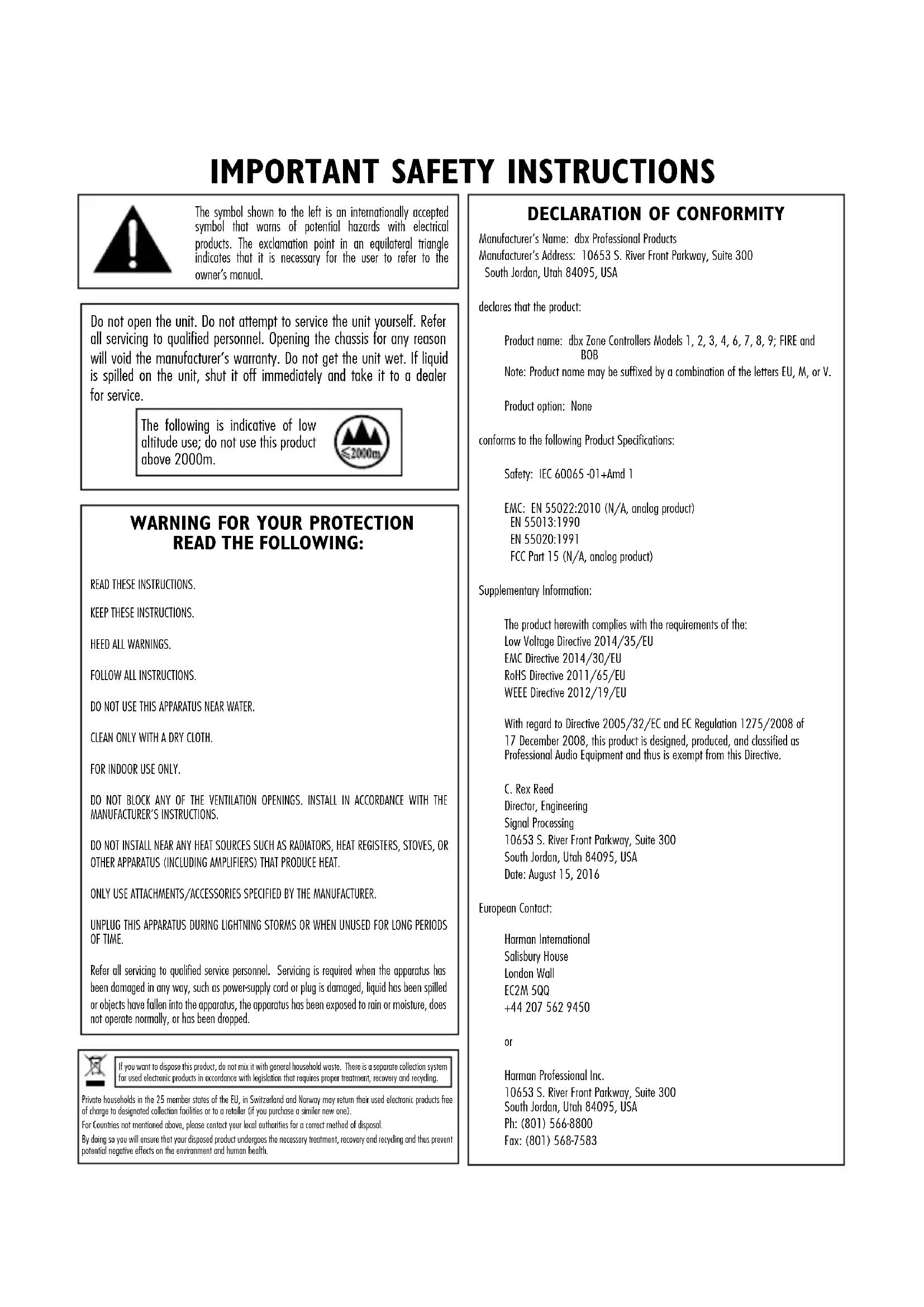 Manufacturer’s Name: dbx Professional ProductsManufacturer’s Address: 10653 S. River Front Parkway, Suite 300 South Jordan, Utah 84095, USA declares that the product:Product name: dbx Zone Controllers Models 1, 2, 3, 4, 6, 7, 8, 9; FIRE and BOB Note: Product name may be suffixed by a combination of the letters EU, M, or V.Product option: Noneconforms to the following Product Specifications:Safety: IEC 60065 -01+Amd 1EMC: EN 55022:2010 (N/A, analog product) EN 55013:1990 EN 55020:1991 FCC Part 15 (N/A, analog product) Supplementary Information:The product herewith complies with the requirements of the:Low Voltage Directive 2014/35/EUEMC Directive 2014/30/EURoHS Directive 2011/65/EUWEEE Directive 2012/19/EUWith regard to Directive 2005/32/EC and EC Regulation 1275/2008 of 17 December 2008, this product is designed, produced, and classified as Professional Audio Equipment and thus is exempt from this Directive.C. Rex ReedDirector, EngineeringSignal Processing10653 S. River Front Parkway, Suite 300South Jordan, Utah 84095, USA Date: August 15, 2016European Contact:Harman InternationalSalisbury HouseLondon WallEC2M 5QQ+44 207 562 9450 Harman Professional Inc.10653 S. River Front Parkway, Suite 300South Jordan, Utah 84095, USA Ph: (801) 566-8800Fax: (801) 568-7583