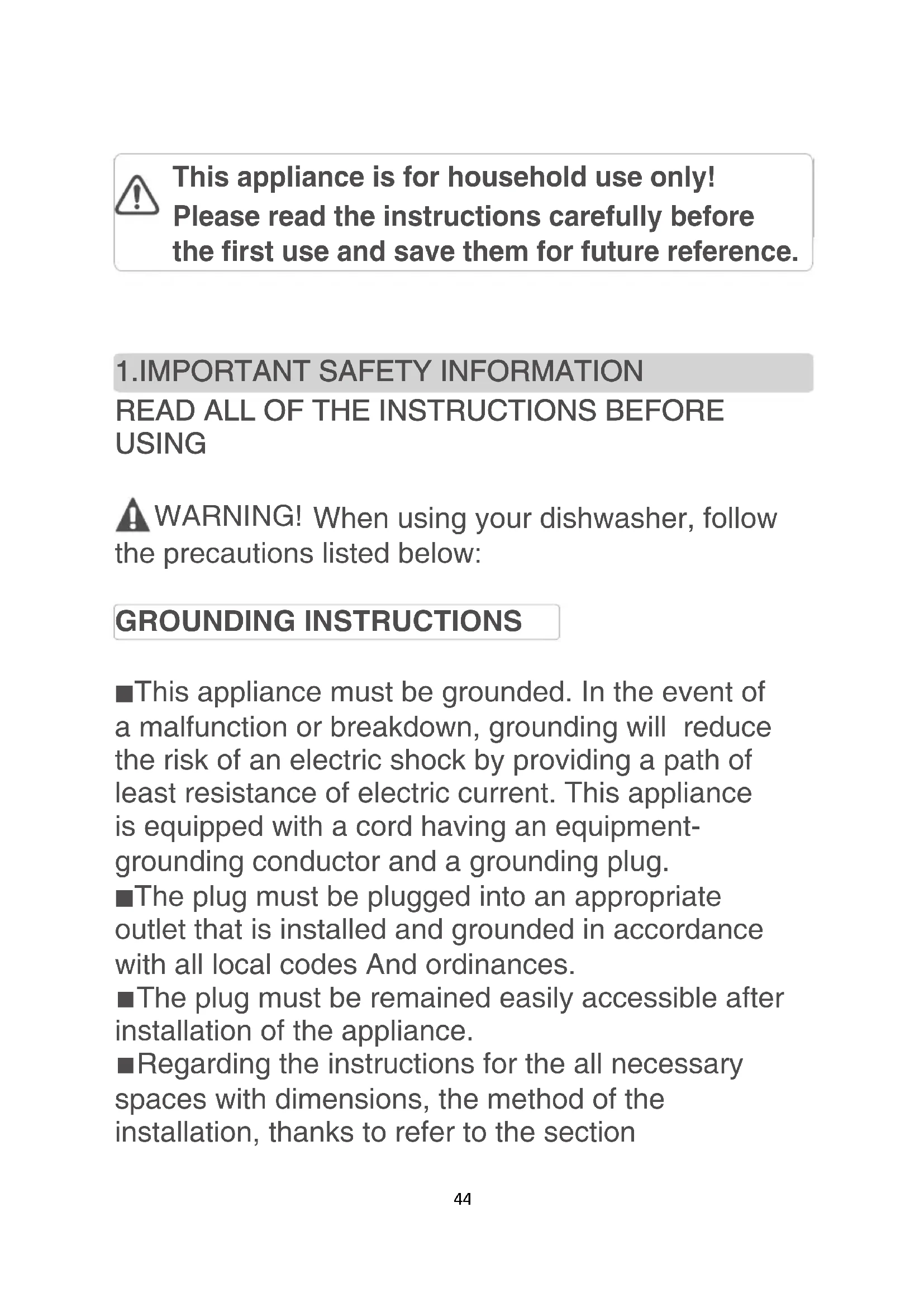 13. CORRECT DISPOSAL OF THIS PRODUCT.......................................................................................84This appliance is for household use only! Please read the instructions carefully before the first use and save them for future reference. ■This appliance must be grounded. In the event of a malfunction or breakdown, grounding will reduce the risk of an electric shock by providing a path of least resistance of electric current. This appliance is equipped with a cord having an equipment- grounding conductor and a grounding plug. When using your dishwasher, follow the precautions listed below: