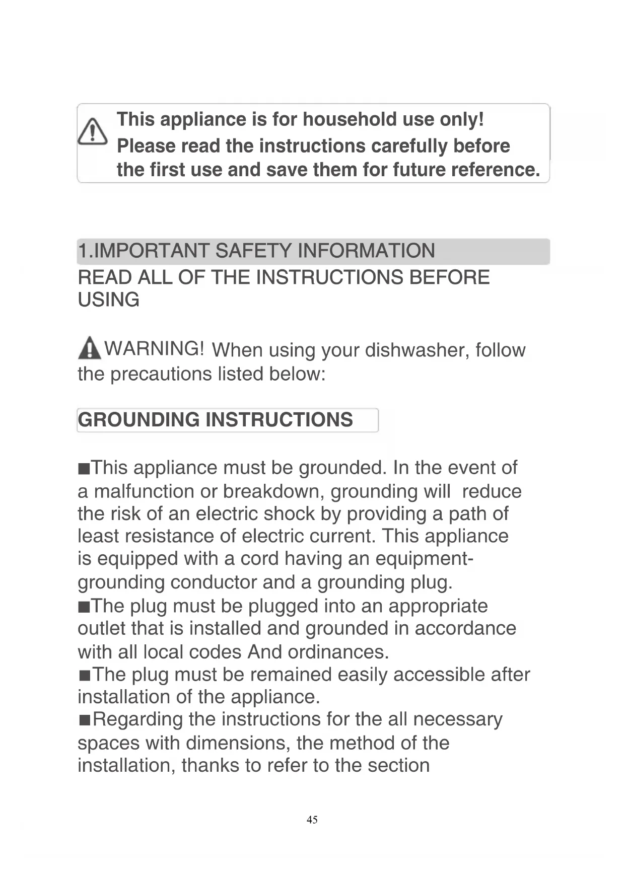 USING GROUNDING INSTRUCTIONS WARNING! ■The plug must be plugged into an appropriate outlet that is installed and grounded in accordance with all local codes And ordinances. ■The plug must be remained easily accessible after installation of the appliance. ■Regarding the instructions for the all necessary spaces with dimensions, the method of the installation, thanks to refer to the section 45■Improper connection of the equipment-grounding conductor can result in the risk of an electric shock. WARNING! “INSTALLATION INSTRUCTION ■Check with a qualified electrician or service representative if you are in doubt whether the appliance is properly grounded. Do not modify the plug provided with the appliance; If it does notfit the outlet. Have a proper outlet installed by a qualified electrician.