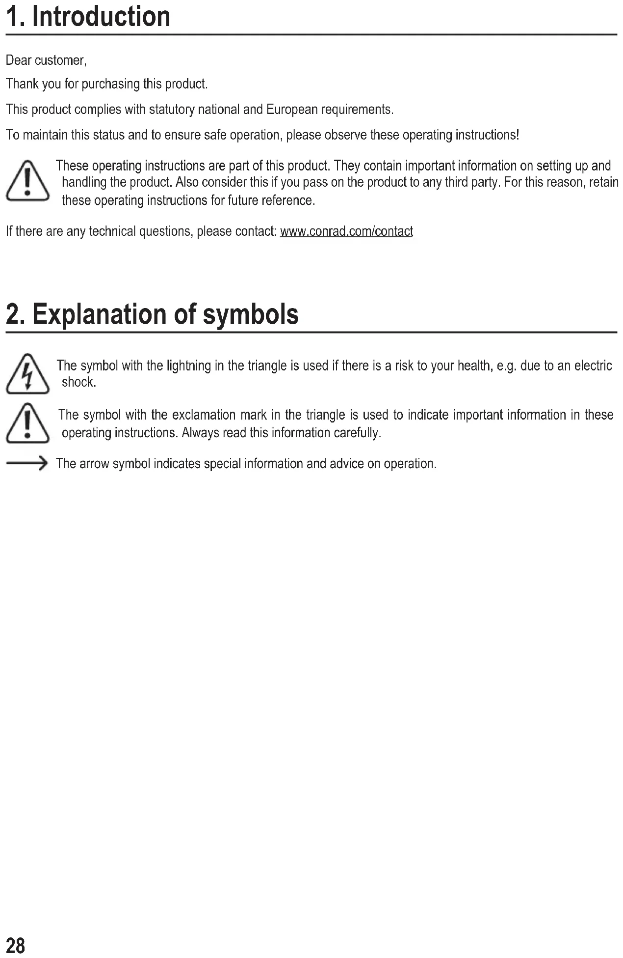 Dear customer, Thank you for purchasing this product. This product complies with statutory national and European requirements. To maintain this status and to ensure safe operation, please observe these operating instructions! These operating instructions are part of this product. They contain important information on setting up and handling the product. Also consider this if you pass on the product to any third party. For this reason, retain these operating instructions for future reference. If there are any technical questions, please contact: www.conrad.com/contact