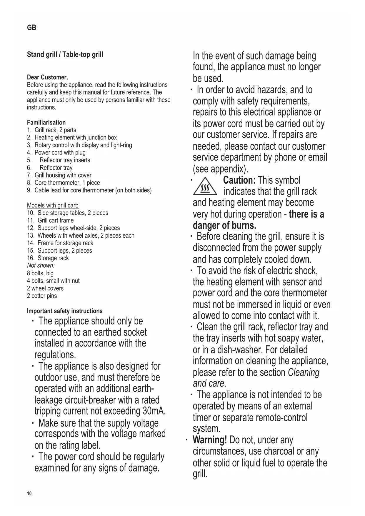 Caution: This symbol indicates that the grill rack and heating element may become very hot during operation - there is a danger of burns. ∙ Before cleaning the grill, ensure it is disconnected from the power supply and has completely cooled down. ∙ To avoid the risk of electric shock, the heating element with sensor and power cord and the core thermometer must not be immersed in liquid or even allowed to come into contact with it. ∙ Cleanthegrillrack,reectortrayand the tray inserts with hot soapy water, or in a dish-washer. For detailed information on cleaning the appliance, please refer to the section Cleaning and care. ∙ The appliance is not intended to be operated by means of an external timer or separate remote-control system. ∙ Warning! Do not, under any circumstances, use charcoal or any other solid or liquid fuel to operate the grill. GB11 142 x 208 mm ∙ Caution: Do not cover the grill rack with aluminium foil, barbecue dishes or other items, as the resulting build- up of heat could seriously damage the grill. ∙ A maximum of 2 litres of water may be pouredintothereectortray. ∙ This appliance is intended for domestic or similar applications, such