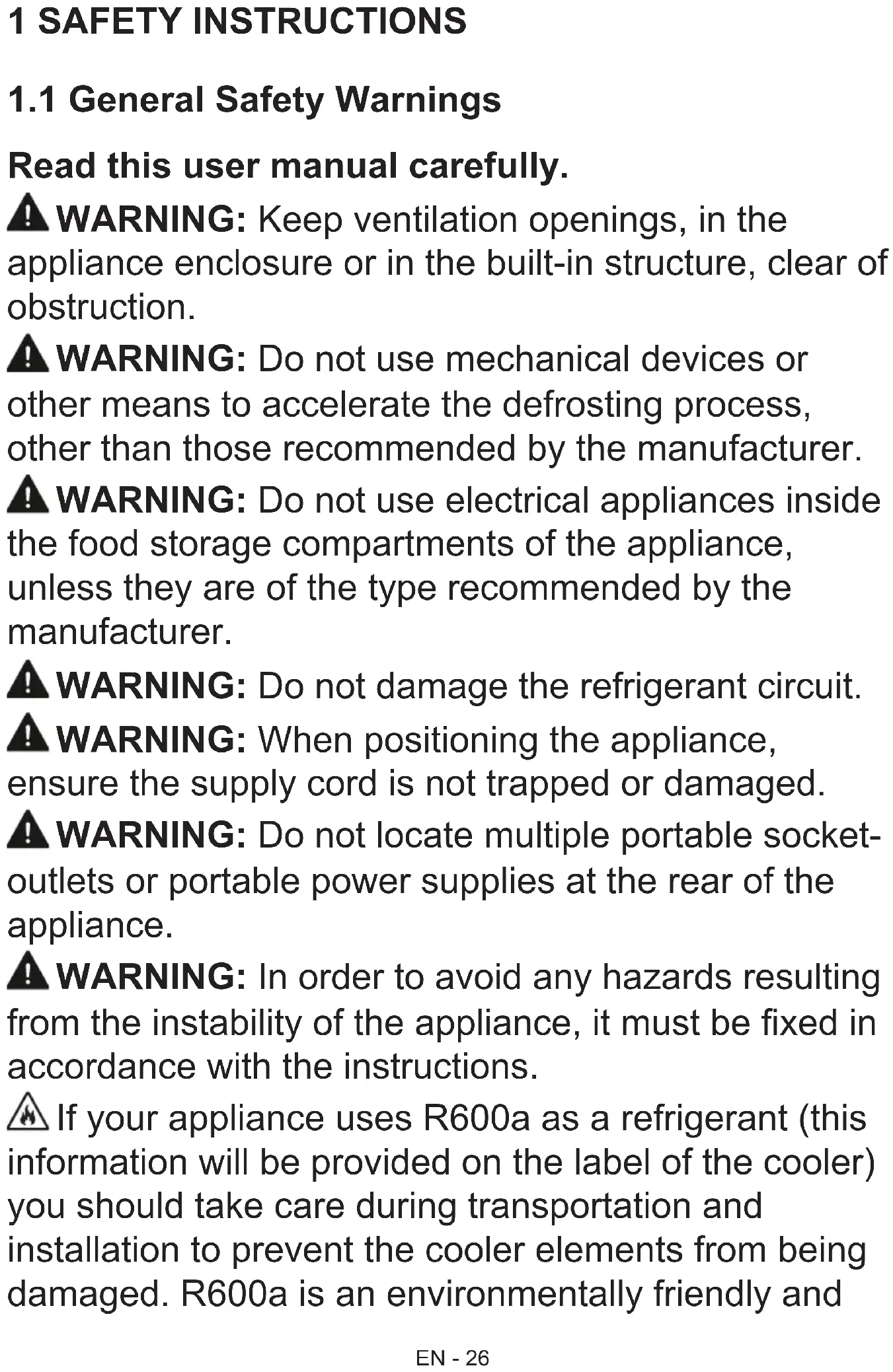 from the instability of the appliance, it must be xed in accordance with the instructions. If your appliance uses R600a as a refrigerant (this information will be provided on the label of the cooler) you should take care during transportation and installation to prevent the cooler elements from being damaged. R600a is an environmentally friendly andEN - 27 natural gas, but it is explosive. In the event of a leak due to damage of the cooler elements, move your fridge away from open ames or heat sources and ventilate the room where the appliance is located for a few minutes.
