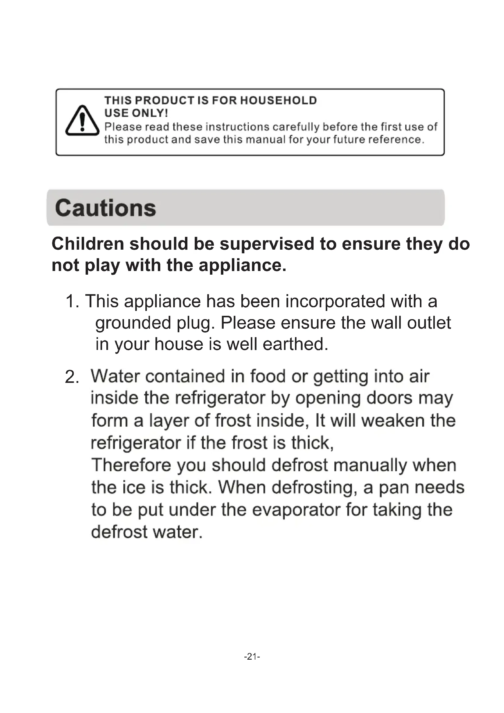 30.– Clean water tanks if they have not been used for 48 h; flush the water system connected to a water supply if water has not been drawn for 5 days. – Store raw meat and fish in suitable containers in the refrigerator, so that it is not in contact with or drip onto other food. – Two-star frozen-food compartments are suitable for storing pre-frozen food, storing or making ice-cream and making ice cubes. – One-, two- and three-star compartments are not suitable for the freezing of fresh food. – If the refrigerating appliance is left empty for long periods, switch off, defrost, clean, dry, and leave the door open to prevent mould developing within the appliance. 31.This refrigerating appliance is not intended to be used as a built-in appliance.