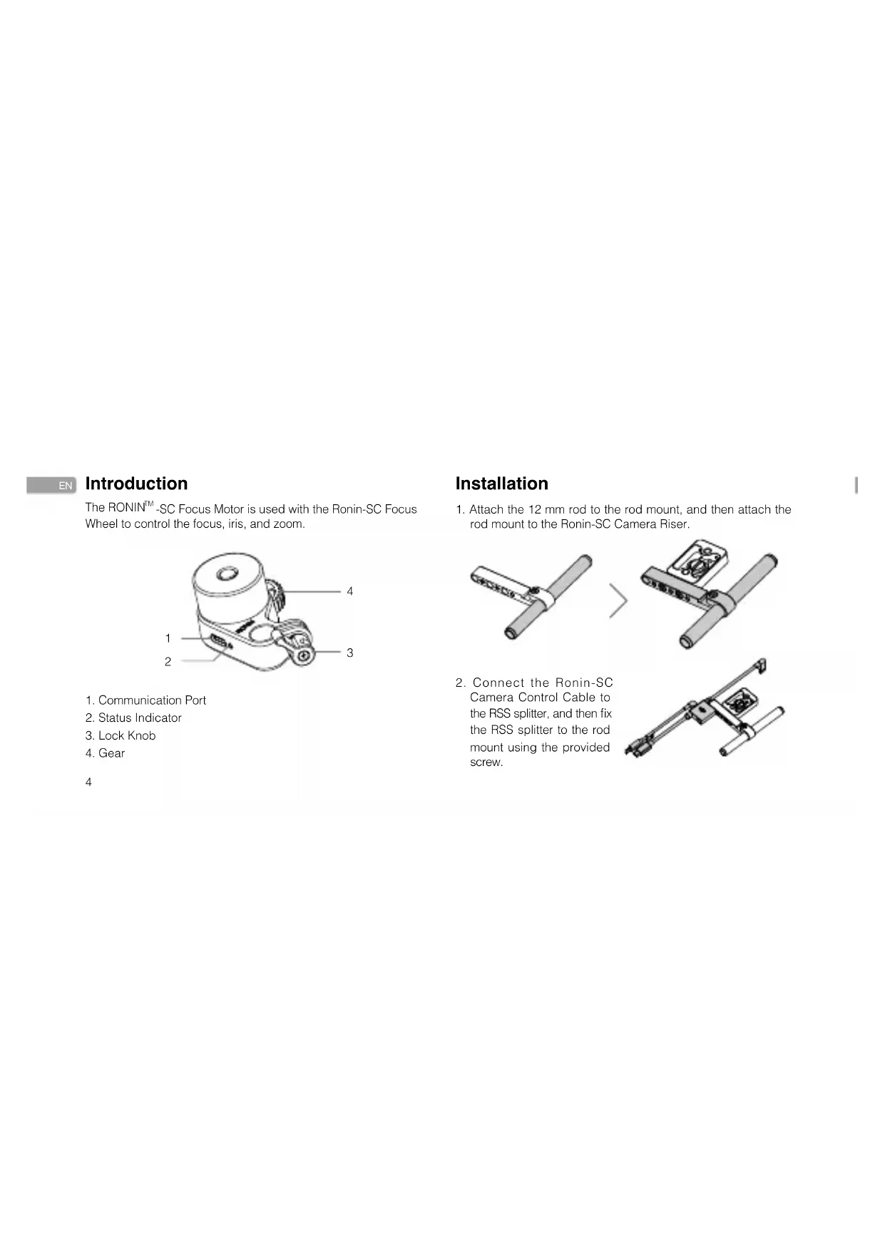 to the camera, attach the camera to Ronin-SC. Connect the camera, Ronin-SC, and Focus motor according to the figure below. Usage Control the focus motor by using the focus wheel after powering on Ronin-SC.