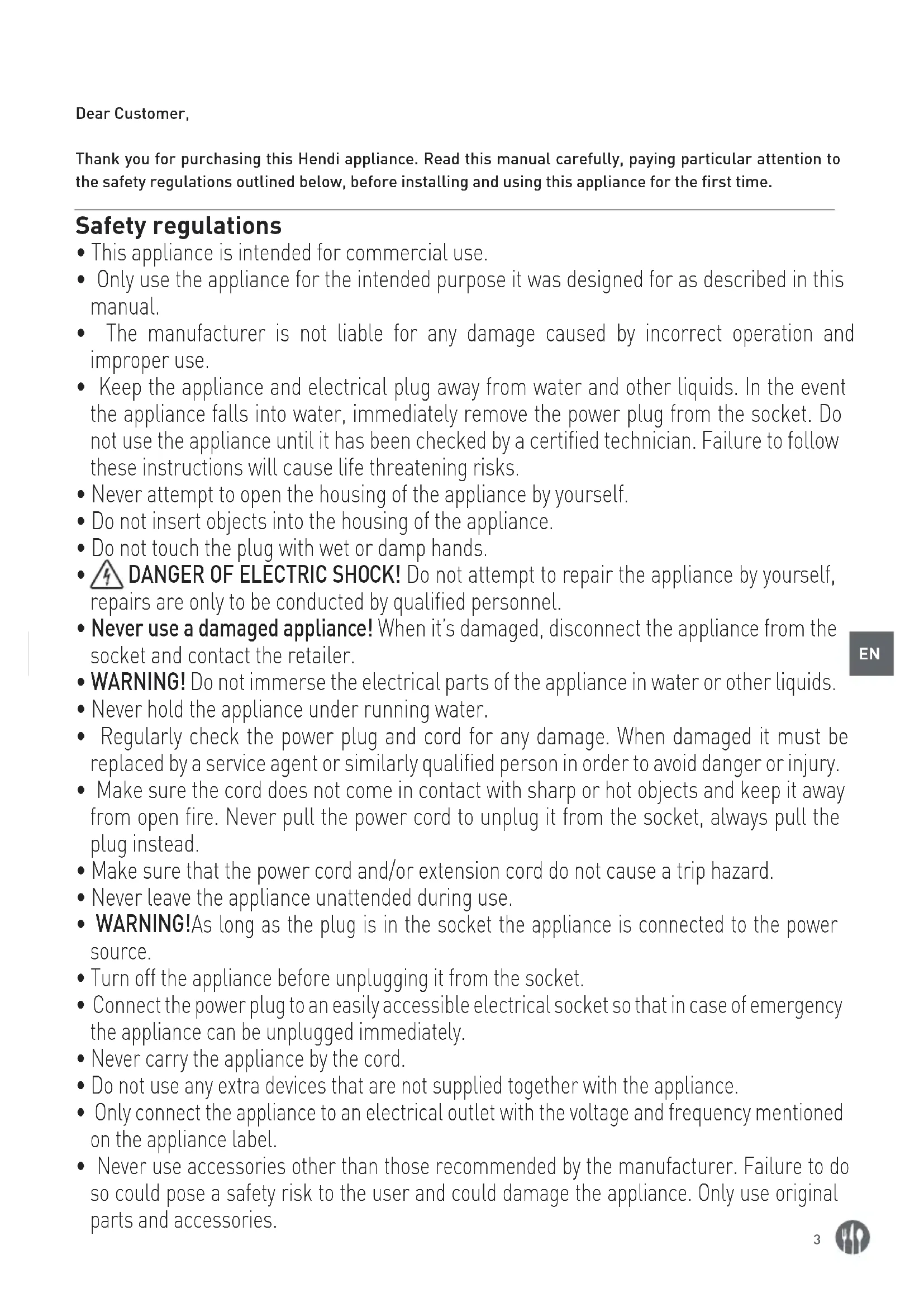 Dear Customer, Thank you for purchasing this Hendi appliance. Read this manual carefully, paying particular attention to the safety regulations outlined below, before installing and using this appliance for the first time. Safety regulations