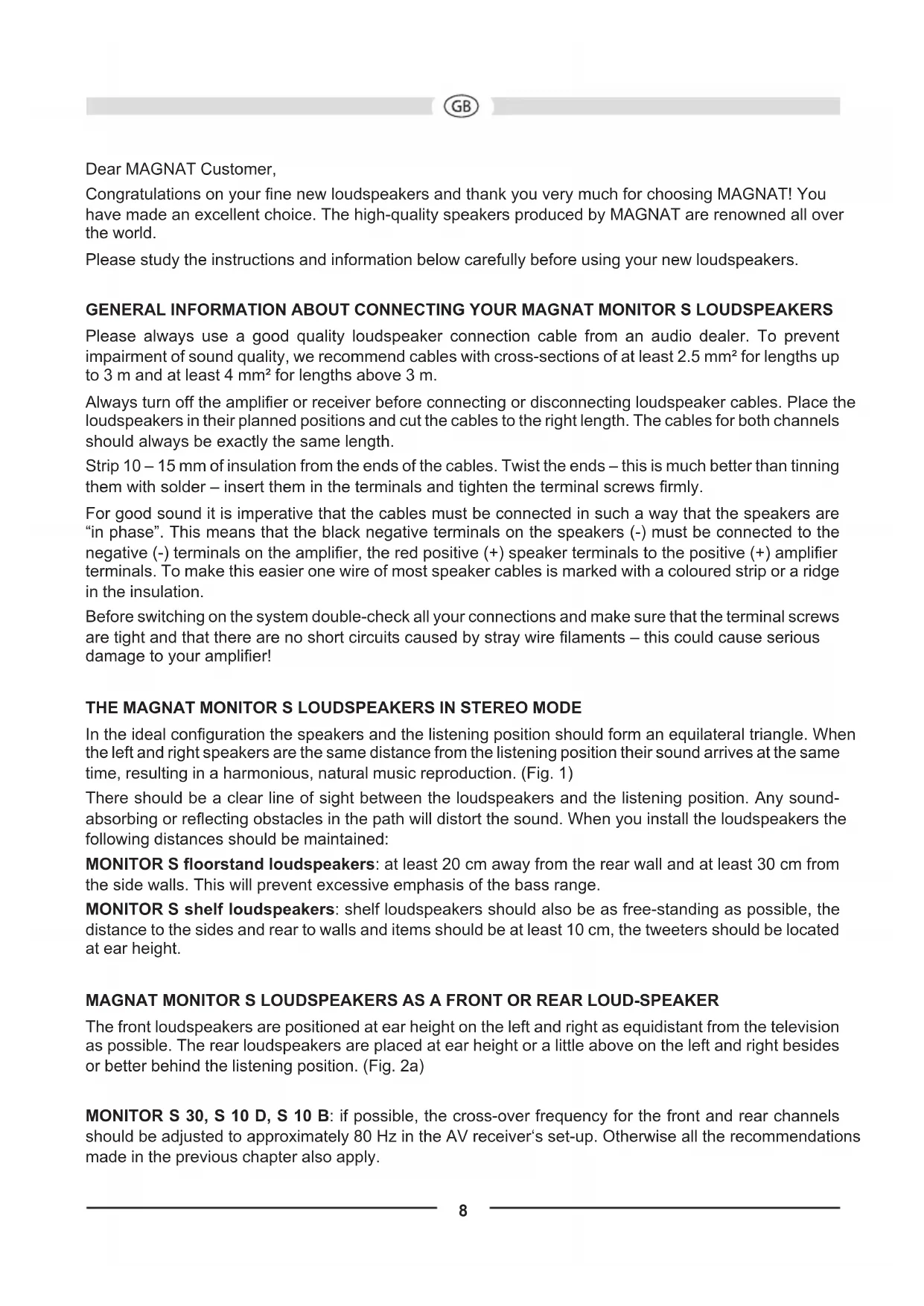 Konguration: 2 Wege “Dipol” 2 Wege Belastbarkeit: 60 / 120 Watt 60 / 120 Watt Impedanz: 4 – 8 Ohm 4 – 8 Ohm Frequenzbereich: 42 – 32 000 Hz 42 – 32 000 Hz Empfohlene Verstärkerleistung: 20 – 120 Watt 20 – 120 Watt Wirkungsgrad (2.8V/1 m): 88 dB 88 dB Maße (BxHxT): 149 x 250 x 130 mm 149 x 250 x 190 mm Zubehör: Gummifüße Gummifüße Technische Änderungen vorbehalten.8 Dear MAGNAT Customer, Congratulations on your ne new loudspeakers and thank you very much for choosing MAGNAT! You have made an excellent choice. The high-quality speakers produced by MAGNAT are renowned all over the world. Please study the instructions and information below carefully before using your new loudspeakers. GENERAL INFORMATION ABOUT CONNECTING YOUR MAGNAT MONITOR S LOUDSPEAKERS Please always use a good quality loudspeaker connection cable from an audio dealer. To prevent impairment of sound quality, we recommend cables with cross-sections of at least 2.5 mm² for lengths up to 3 m and at least 4 mm² for lengths above 3 m. Always turn off the amplier or receiver before connecting or disconnecting loudspeaker cables. Place the loudspeakers in their planned positions and cut the cables to the right length. The cables for both channels should always be exactly the same length. Strip 10 – 15 mm of insulation from the ends of the cables. Twist the ends – this is much better than tinning them with solder – insert them in the terminals and tighten the terminal screws rmly. For good sound it is imperative that the cables must be connected in such a way that the speakers are “in phase”. This means that the black negative terminals on the speakers (-) must be connected to the negative (-) terminals on the amplier, the red positive (+) speaker terminals to the positive (+) amplier terminals. To make this easier one wire of most speaker cables is marked with a coloured strip or a ridge in the insulation. Before switching on the system double-check all your connections and make sure that the terminal screws are tight and that there are no short circuits caused by stray wire laments – this could cause serious damage to your amplier! THE MAGNAT MONITOR S LOUDSPEAKERS IN STEREO MODE In the ideal conguration the speakers and the listening position should form an equilateral triangle. When the left and right speakers are the same distance from the listening position their sound arrives at the same time, resulting in a harmonious, natural music reproduction. (Fig. 1) There should be a clear line of sight between the loudspeakers and the listening position. Any sound- absorbing or reecting obstacles in the path will distort the sound. When you install the loudspeakers the following distances should be maintained: MONITOR S oorstand loudspeakers: at least 20 cm away from the rear wall and at least 30 cm from the side walls. This will prevent excessive emphasis of the bass range. MONITOR S shelf loudspeakers: shelf loudspeakers should also be as free-standing as possible, the distance to the sides and rear to walls and items should be at least 10 cm, the tweeters should be located at ear height. MAGNAT MONITOR S LOUDSPEAKERS AS A FRONT OR REAR LOUD-SPEAKER The front loudspeakers are positioned at ear height on the left and right as equidistant from the television as possible. The rear loudspeakers are placed at ear height or a little above on the left and right besides or better behind the listening position. (Fig. 2a) MONITOR S 30, S 10 D, S 10 B: if possible, the cross-over frequency for the front and rear channels should be adjusted to approximately 80 Hz in the AV receiver‘s set-up. Otherwise all the recommendations made in the previous chapter also apply.9
