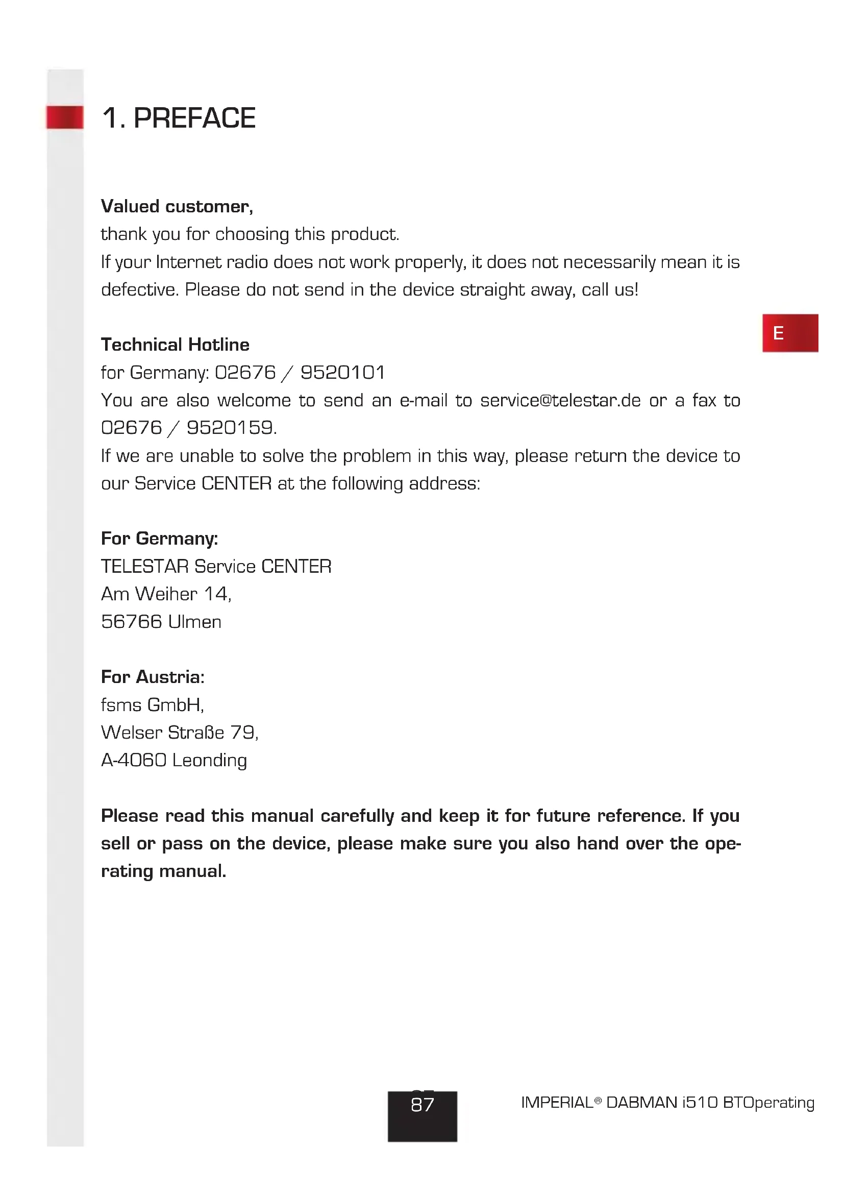 Valued customer, thank you for choosing this product. If your Internet radio does not work properly, it does not necessarily mean it is defective. Please do not send in the device straight away, call us! Technical Hotline for Germany: 02676 / 9520101 You are also welcome to send an e-mail to service@telestar.de or a fax to 02676 / 9520159. If we are unable to solve the problem in this way, please return the device to our Service CENTER at the following address: For Germany: TELESTAR Service CENTER Am Weiher 14, 56766 Ulmen For Austria: fsms GmbH, Welser Straße 79, A-4060 Leonding Please read this manual carefully and keep it for future reference. If you sell or pass on the device, please make sure you also hand over the ope- rating manual.