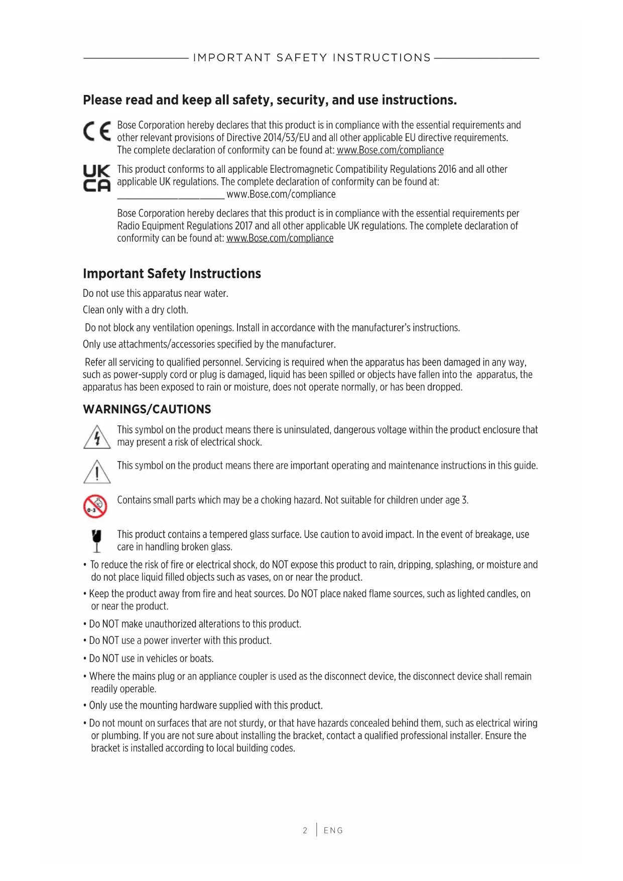 Please read and keep all safety, security, and use instructions. Bose Corporation hereby declares that this product is in compliance with the essential requirements and other relevant provisions of Directive 2014/53/EU and all other applicable EU directive requirements. The complete declaration of conformity can be found at: www.Bose.com/compliancewww.Bose.com/compliance This product conforms to all applicable Electromagnetic Compatibility Regulations 2016 and all other applicable UK regulations. The complete declaration of conformity can be found at: www.Bose.com/compliancewww.Bose.com/compliance Bose Corporation hereby declares that this product is in compliance with the essential requirements per Radio Equipment Regulations 2017 and all other applicable UK regulations. The complete declaration of conformity can be found at: www.Bose.com/compliancewww.Bose.com/compliance Important Safety Instructions Do not use this apparatus near water. Clean only with a dry cloth. Do not block any ventilation openings. Install in accordance with the manufacturer’s instructions. Only use attachments/accessories specified by the manufacturer. Refer all servicing to qualified personnel. Servicing is required when the apparatus has been damaged in any way, such as power-supply cord or plug is damaged, liquid has been spilled or objects have fallen into the apparatus, the apparatus has been exposed to rain or moisture, does not operate normally, or has been dropped. WARNINGS/CAUTIONS This symbol on the product means there is uninsulated, dangerous voltage within the product enclosure that may present a risk of electrical shock. This symbol on the product means there are important operating and maintenance instructions in this guide. Contains small parts which may be a choking hazard. Not suitable for children under age 3. This product contains a tempered glass surface. Use caution to avoid impact. In the event of breakage, use care in handling broken glass.