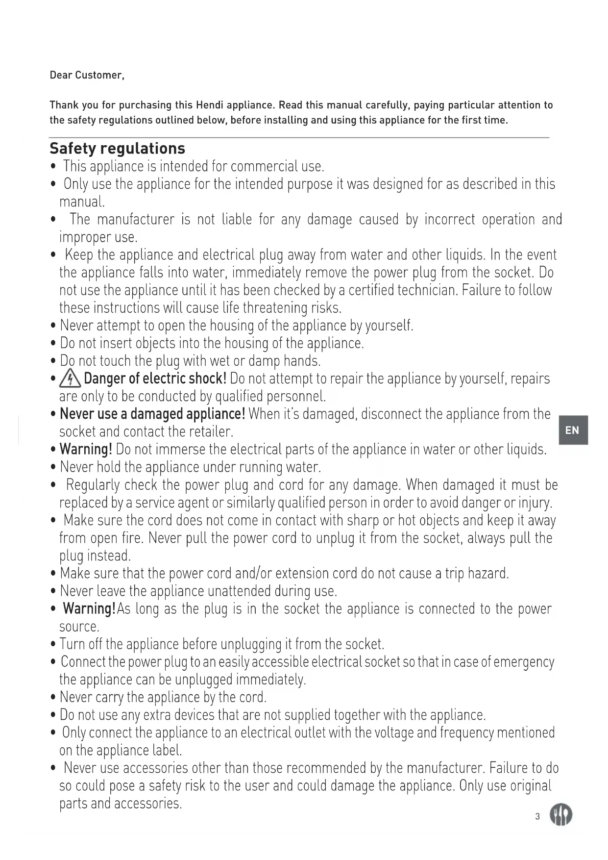 Dear Customer, Thank you for purchasing this Hendi appliance. Read this manual carefully, paying particular attention to the safety regulations outlined below, before installing and using this appliance for the first time. Safety regulations