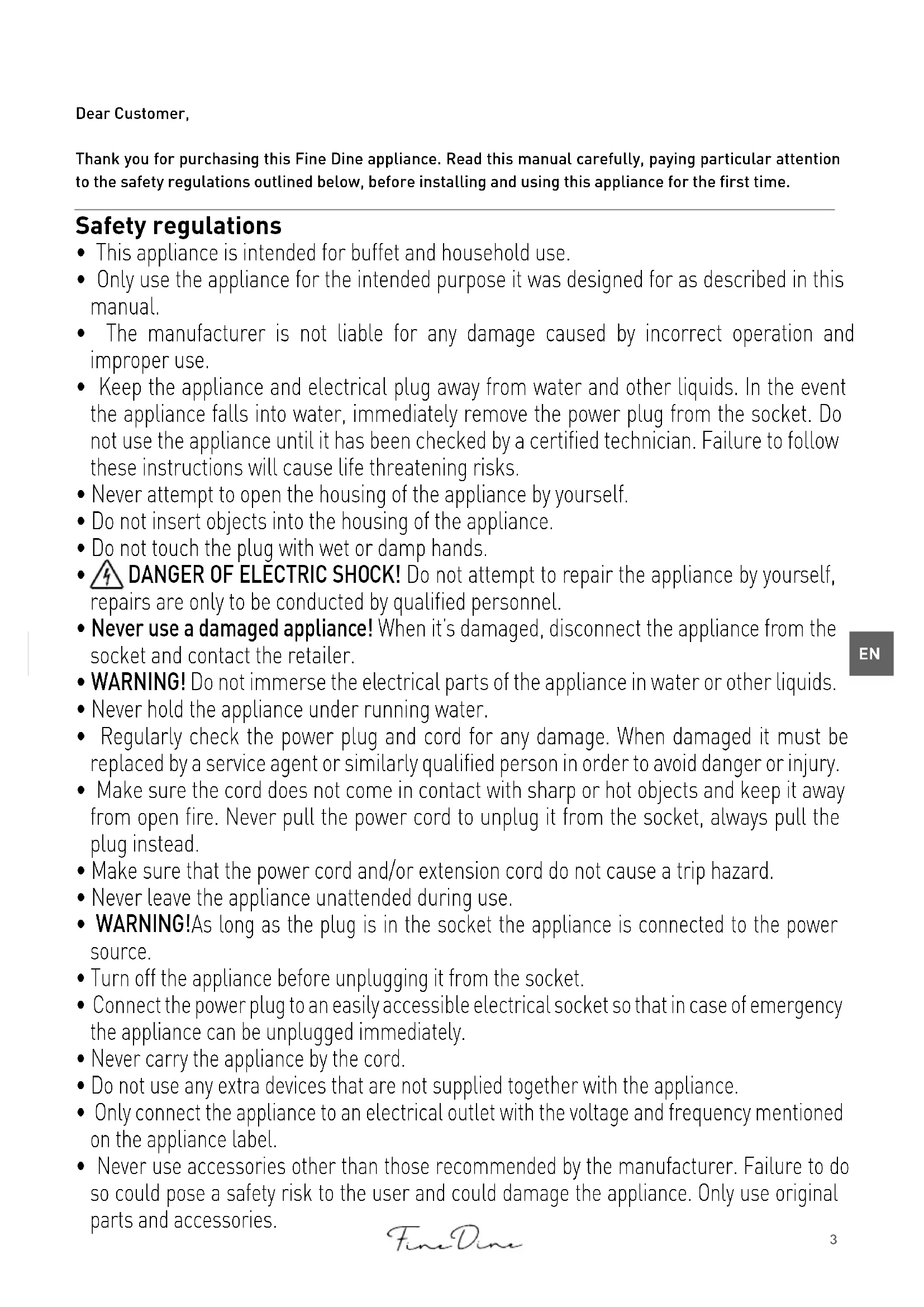 Dear Customer, Thank you for purchasing this Fine Dine appliance. Read this manual carefully, paying particular attention to the safety regulations outlined below, before installing and using this appliance for the first time. Safety regulations