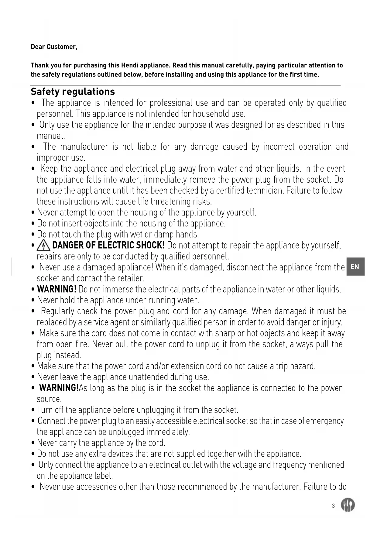 Dear Customer, Thank you for purchasing this Hendi appliance. Read this manual carefully, paying particular attention to the safety regulations outlined below, before installing and using this appliance for the first time. Safety regulations