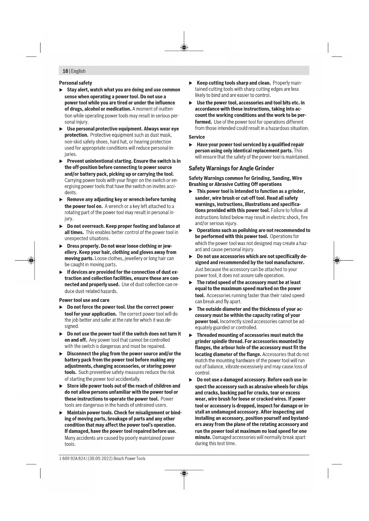 The vibration level given in these instructions has been measured in accordance with a standardised measuring pro- cedure and may be used to compare power tools. It can also be used for a preliminary estimation of exposure to vibra- tion. The stated vibration level applies to the main applications of the power tool. However, if the power tool is used for differ- ent applications, with different application tools or poorly maintained, the vibration level may differ. This can signific- antly increase the exposure to vibration over the total work- ing period. Bosch Power Tools 1 609 92A 824 | (30.09.2022)20 | English To estimate the exposure to vibration accurately, the times when the tool is switched off or when it is running but not ac- tually being used should also be taken into account. This can significantly reduce the exposure to vibration over the total working period. Implement additional safety measures to protect the oper- ator from the effects of vibration, such as servicing the power tool and application tools, keeping the hands warm, and organising workflows correctly. Fitting Fitting Protective Equipment u Pull the plug out of the socket before carrying out any work on the power tool. Note: If the grinding disc breaks during operation or the holding fixtures on the protective guard/power tool become damaged, the power tool must be sent to the after-sales ser- vice immediately; see the "After-Sales Service and Applica- tion Service" section for addresses. Protective guard for grinding Place the protective guard (6) on the spindle collar. Adjust the position of the protective guard (6) to the requirements of the operation and lock the protective guard (6) with the locking screw (7). u Adjust the protective guard (6) such that sparking in the direction of the operator is prevented. Protective guard for cutting u Always use the protective guard for cutting (14) when cutting with bonded abrasives. u Provide sufficient dust extraction when cutting stone. The protective guard for cutting (14) is fitted in the same way as the protective guard for grinding (6). Extraction guard for cutting with a guide block Observe the operating instructions of the extraction guard when fitting the extraction guard for cutting with a cutting guide(23). Side handle u Do not operate your power tool without the side handle (3). Screw the side handle (3) on the left or right of the machine head depending on how your are working. Hand guard u Always fit the hand guard (16) when working with the rubber sanding plate (18) or with the cup brush/disc brush/flap disc. Attach the hand guard (16) to the side handle (3). Fitting the Abrasive Tools u Pull the plug out of the socket before carrying out any work on the power tool. u Do not touch grinding and cutting discs until they have cooled down. The discs can become very hot while work- ing. Clean the grinding spindle (5) and all the parts to be fitted. Lock the grinding spindle with the spindle lock button (1) before clamping and releasing the abrasive tools. u Do not press the spindle lock button while the grind- ing spindle is moving. The power tool may become dam- aged if you do this. Grinding/cutting disc Pay attention to the dimensions of the abrasive tools. The diameter of the hole must match that of the mounting flange. Do not use an adapter or reducer. When using diamond cutting discs, ensure that the arrow in- dicating the direction of rotation on the diamond cutting disc matches the direction of rotation of the power tool (see the direction of rotation arrow on the machine head). See the graphics page for assembly instructions. To fasten the grinding/cutting disc, screw on the clamping nut(10) and tighten with the two-hole spanner. (see " Quick- clamping nut ", page21). u After fitting the abrasive tool, check that the abrasive tool is fitted correctly and can turn freely before switching on the power tool. Make sure that the abras- ive tool does not brush against the protective guard or other parts. A plastic part (O-ring) is fitted around the cent- ring collar in the mounting flange (8). If the O- ring is missing or damaged, the mounting flange (8) must be replaced before operation can resume. Flap disc u Always fit the hand guard (16) when working with the flap disc. Rubber sanding pad u Always fit the hand guard (16) when working with the rubber sanding pad (18). See the graphics page for fitting instructions. Before fitting the rubber sanding pad (18), place the two spacer discs (17) on the grinding spindle (5). Screw on the round nut (20) and tighten with the two-pin spanner. Cup brush/disc brush u Always fit the hand guard (16) when working with the cup brush or disc brush. See the graphics page for fitting instructions. The cup brush/disc brush must be screwed onto the grinding spindle until it rests firmly against the grinding spindle flange at the end of the grinding spindle thread. Tighten the cup brush/disc brush with an open-ended spanner. 1 609 92A 824 | (30.09.2022) Bosch Power ToolsEnglish | 21 Quick-clamping nut To change the abrasive tool easily without having to use any additional tools, you can use the quick-clamping nut (12) in- stead of the clamping nut (10). u The quick-clamping nut (12) may be used only for grinding or cutting discs or disc brushes with hole dia- meter 22.2mm. Only use quick-clamping nuts (12) that are in good work- ing order and not damaged. When screwing on, make sure that the printed side of the quick-clamping nut (12) is not facing the grinding disc; the arrow must be pointing towards the index mark (24). (24) Press the spindle lock but- ton (1) to lock the grinding spindle. To tighten the quick-clamping nut, turn the grinding disc firmly clockwise. If the quick-clamping nut has been attached correctly and is not damaged, you can loosen it by hand by turning the knurled ring an- ticlockwise. If the quick- clamping nut is stuck, do not attempt to loosen it with pliers – always use the two-pin spanner. Posi