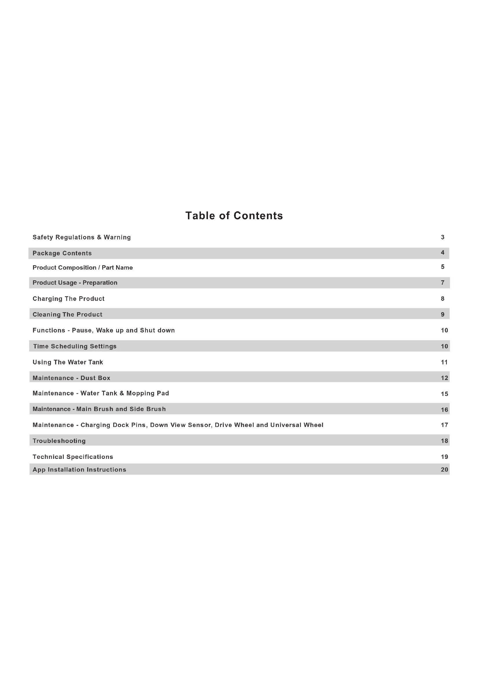 Safety Regulations & Warning 3Safety Regulations Before using this product, please read the following safety instructions and follow all routine safety precautions. Please read the instructions carefully, please keep the instructions.Any operation inconsistent with this instruction manual may cause damage to this product. Only authorized technicians can disassemble this product. Users are not recommended to disassemble this product by themselves. This product can only use the power adapter provided by the factory. If other adapters are used, the product maybe damaged. Do not touch wires, sockets or power adapters when your hands are wet. Do not use cloth curtains or body parts to roll into the product drive wheels. Do not place this product near cigarette butts, lighters and other smoldering fires. Please clean the product after charging. Do not bend wires excessively or place heavy objects and sharp objects on the machine. This..product is an indoor household product. Do not use it outdoors. Do not sit on the product. Do not use this product (e.g. bathroom) in wet environment. Before using this product, please remove all vulnerable items (e.g. glasses, lamps, etc.) on the ground as well as items (e.g. wires, pa per sheets, curtains) that may entangle the side brushes and air suction passages. Do not put this product in a place where it is easy to fall (e.g. on desks and chairs). Please carefully check whether the power adapter is connected to the socket before use, otherwise the battery may be damaged. To prevent tripping, please inform other members of the house when this product works. Please empty the dust box before using this product when the dust box is full. The temperature used for this product is 0 to 40 degrees celsius. Do not use this product in high temperature environment. Please remove the battery from the machine before the product isscrapped. Please make sure that this product is not powered on when removing the battery. Please recycle the discarded batteries safely. Use only the original rechargeable battery and charging seat specially equipped by the manufacturer. Non - rechargeable batteries are strictly prohibited, please refer to" product parameters" for battery specification information. It is forbidden to use products in environments with open flames or fragile objects. It is forbidden to use products in extremely hot (above 40 ℃) or extremely cold (below 0