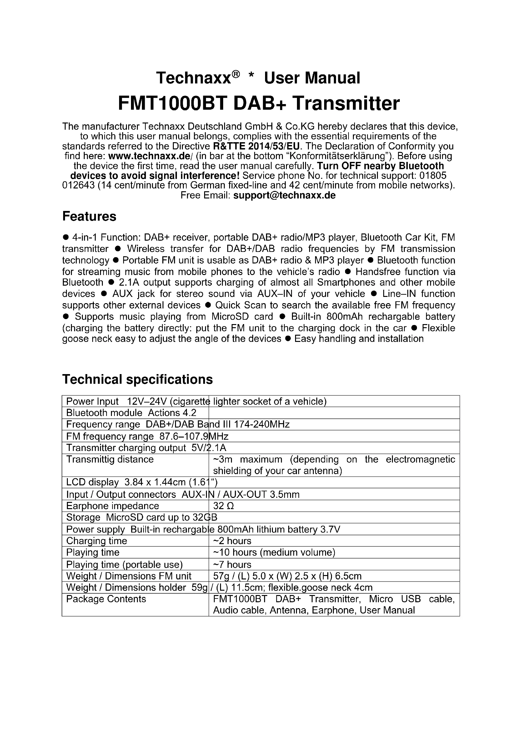 - User Manual FMT1000BT DAB+ Transmitter The manufacturer Technaxx Deutschland GmbH & Co.KG hereby declares that this device, to which this user manual belongs, complies with the essential requirements of the standards referred to the Directive R&TTE 2014/53/EU. The Declaration of Conformity you find here: www.technaxx.de/ (in bar at the bottom “Konformitätserklärung”). Before using the device the first time, read the user manual carefully. Turn OFF nearby Bluetooth devices to avoid signal interference! Service phone No. for technical support: 01805 012643 (14 cent/minute from German fixed-line and 42 cent/minute from mobile networks). Free Email: support@technaxx.de Features 4-in-1 Function: DAB+ receiver, portable DAB+ radio/MP3 player, Bluetooth Car Kit, FM transmitter Wireless transfer for DAB+/DAB radio frequencies by FM transmission technology Portable FM unit is usable as DAB+ radio & MP3 player Bluetooth function for streaming music from mobile phones to the vehicle’s radio Handsfree function via Bluetooth 2.1A output supports charging of almost all Smartphones and other mobile devices AUX jack for stereo sound via AUX–IN of your vehicle Line–IN function supports other external devices Quick Scan to search the available free FM frequency Supports music playing from MicroSD card Built-in 800mAh rechargable battery (charging the battery directly: put the FM unit to the charging dock in the car Flexible goose neck easy to adjust the angle of the devices Easy handling and installation Technical specifications Power Input 12V–24V (cigarette lighter socket of a vehicle) Bluetooth module Actions 4.2 Frequency range DAB+/DAB Band III 174-240MHz FM frequency range 87.6–107.9MHz Transmitter charging output 5V/2.1A Transmittig distance ~3m maximum (depending on the electromagnetic shielding of your car antenna) LCD display 3.84 x 1.44cm (1.61“) Input / Output connectors AUX-IN / AUX-OUT 3.5mm Earphone impedance 32 Ω Storage MicroSD card up to 32GB Power supply Built-in rechargable 800mAh lithium battery 3.7V Charging time ~2 hours Playing time ~10 hours (medium volume) Playing time (portable use) ~7 hours Weight / Dimensions FM unit 57g / (L) 5.0 x (W) 2.5 x (H) 6.5cm Weight / Dimensions holder 59g / (L) 11.5cm; flexible.goose neck 4cm Package Contents FMT1000BT DAB+ Transmitter, Micro USB cable, Audio cable, Antenna, Earphone, User ManualCharging (there are 2 ways) (1) Charging the battery of the FM unit: In the car put the FM unit into the docking station (look for correct placement of the contacts, it easily clicks into the docking station of the holder by a magnet). Insert the power supply plug into the cigarette lighter socket of a vehicle. The battery will be charged automatically, no matter if the FM unit is switched ON or OFF. At home, plug the Micro USB cable* (*included) into the FM unit and connect it to a power adaptor** (**not included). The battery is charged regardless of whether the FM unit is on or off. The output of adapter must be 5V 500mAh. Note: To check the charging status of the battery when it is switched off, remove the charging cable and switch the device on. The battery indicator at the top right of the screen shows the status: 3 bars 100%–70%, 2 bars 70%–40%, 1 bar 40%–10%, no bar 10%-0%. (2) Charging other devices on the way in a car with charger unit: When the Docking Station is powered from cigarette lighter socket of a vehicle, connect your mobile phone with a USB cable*** (***not included) to the Docking Station. This unit will serve as mobile phone charger. The output is 5V/2.1A with 10W. View of the device