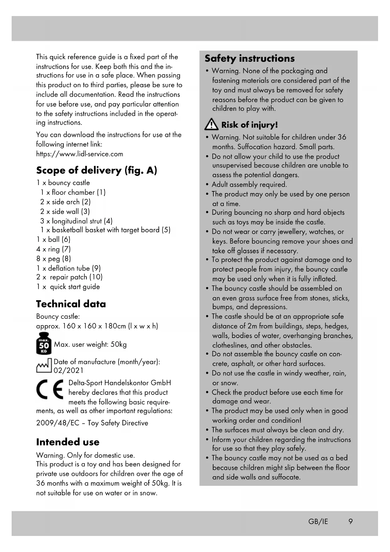 - Ziehen Sie den Flicken vom Papier ab, setzen Sie ihn auf den beschädigten Bereich auf und drücken Sie ihn fest an.9 This quick reference guide is a fixed part of the instructions for use. Keep both this and the in- structions for use in a safe place. When passing this product on to third parties, please be sure to include all documentation. Read the instructions for use before use, and pay particular attention to the safety instructions included in the operat- ing instructions. You can download the instructions for use at the following internet link: https://www.lidl-service.com Scope of delivery (fig. A) 1 x bouncy castle 1 x floor chamber (1) 2 x side arch (2) 2 x side wall (3) 3 x longitudinal strut (4) 1 x basketball basket with target board (5) 1 x ball (6) 4 x ring (7) 8 x peg (8) 1 x deflation tube (9) 2 x repair patch (10) 1 x quick start guide Technical data Bouncy castle: approx. 160 x 160 x 180cm (l x w x h) Max. user weight: 50kg Date of manufacture (month/year): 02/2021 Delta-Sport Handelskontor GmbH hereby declares that this product meets the following basic require- ments, as well as other important regulations: 2009/48/EC – Toy Safety Directive Intended use Warning. Only for domestic use. This product is a toy and has been designed for private use outdoors for children over the age of 36 months with a maximum weight of 50kg. It is not suitable for use on water or in snow. Safety instructions
