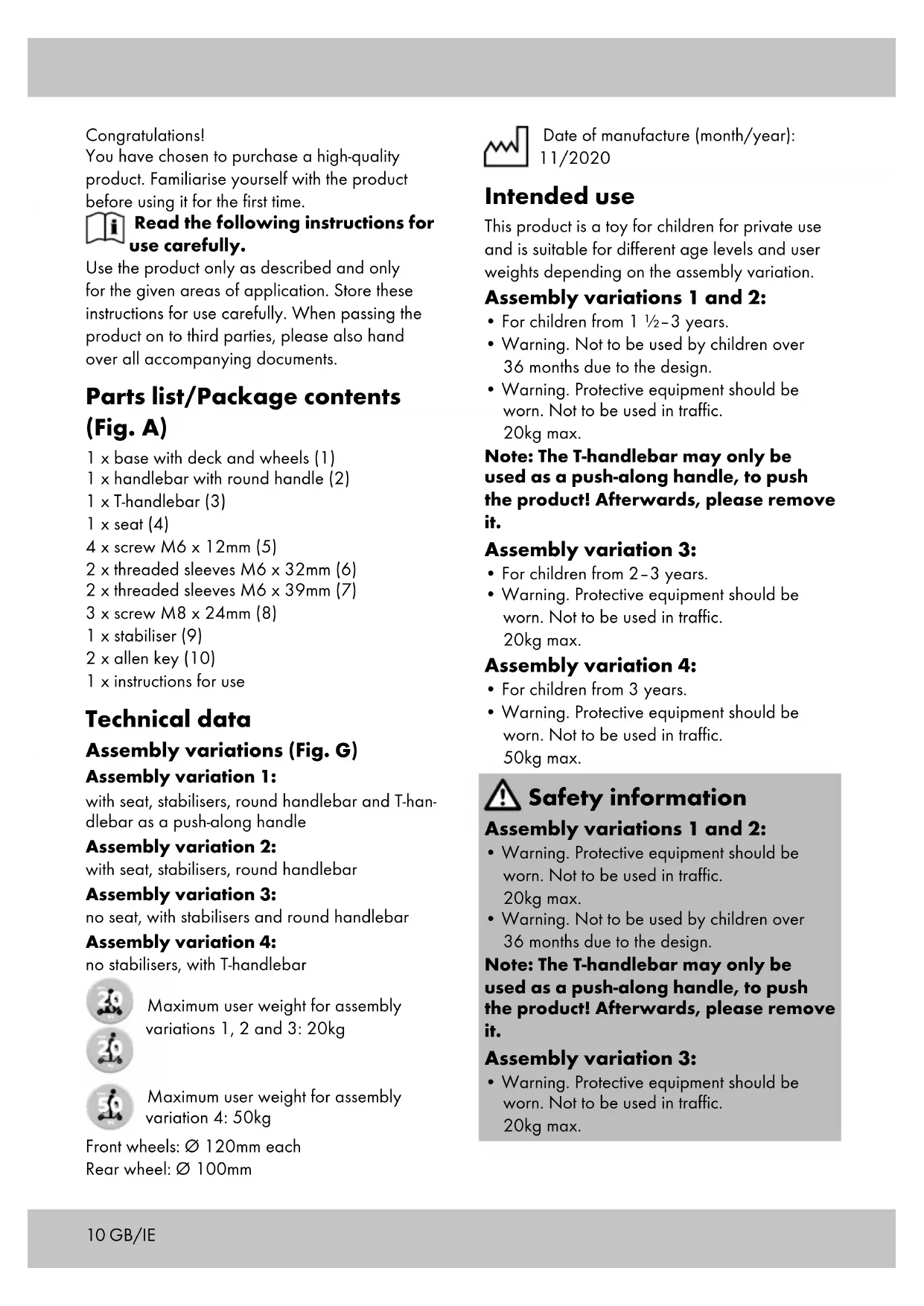 - Warning. Protective equipment should be worn. Not to be used in traffic. 20kg max. Note: The T-handlebar may only be used as a push-along handle, to push the product! Afterwards, please remove it. Assembly variation 3: