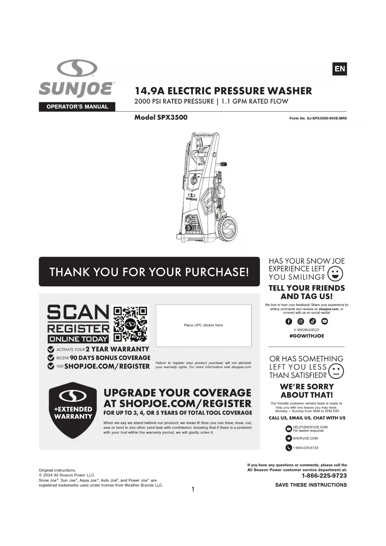 OPERATOR’S MANUALIf you have any questions or comments, please call the All Season Power customer service department at: 1-866-225-9723SAVE THESE INSTRUCTIONSOriginal instructions.© 2024 All Season Power LLC.Snow Joe , Sun Joe , Aqua Joe , Auto Joe , and Power Joe are registered trademarks used under license from Weather Brands LLC.