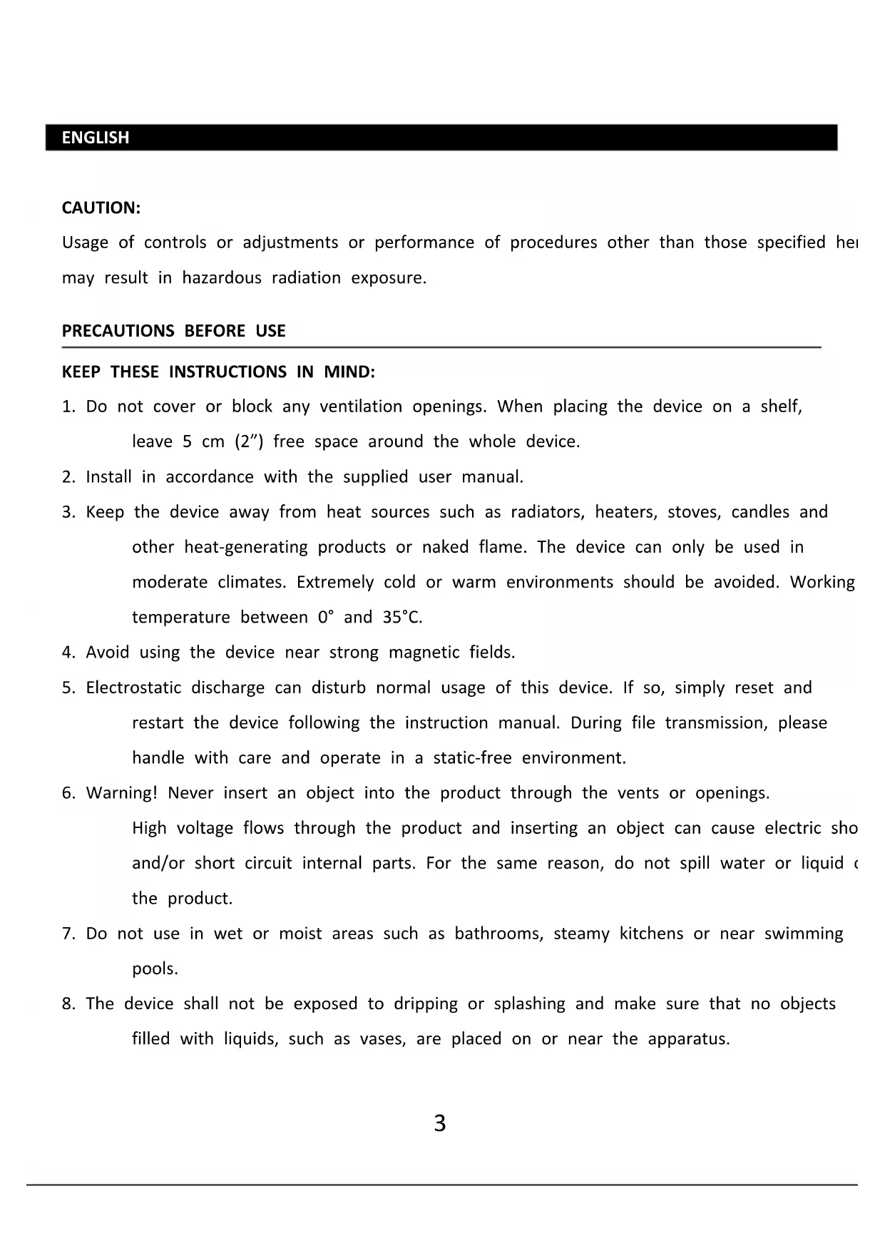 3. Keep the device away from heat sources such as radiators, heaters, stoves, candles and
