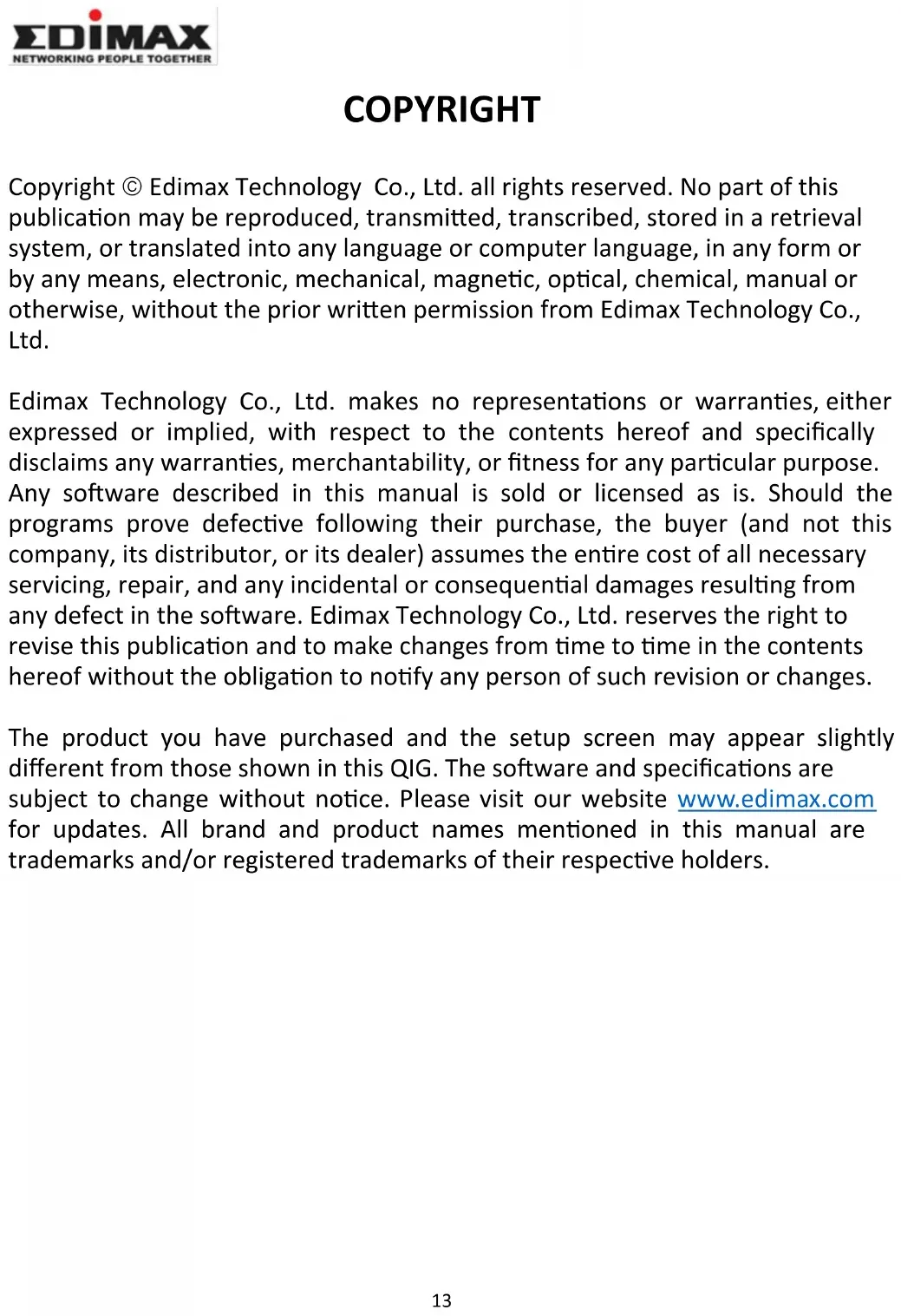 COPYRIGHT Copyright Edimax Technology Co., Ltd. all rights reserved. No part of this publication may be reproduced, transmitted, transcribed, stored in a retrieval system, or translated into any language or computer language, in any form or by any means, electronic, mechanical, magnetic, optical, chemical, manual or otherwise, without the prior written permission from Edimax Technology Co., Ltd. Edimax Technology Co., Ltd. makes no representations or warranties, either expressed or implied, with respect to the contents hereof and specifically disclaims any warranties, merchantability, or fitness for any particular purpose. Any software described in this manual is sold or licensed as is. Should the programs prove defective following their purchase, the buyer (and not this company, its distributor, or its dealer) assumes the entire cost of all necessary servicing, repair, and any incidental or consequential damages resulting from any defect in the software. Edimax Technology Co., Ltd. reserves the right to revise this publication and to make changes from time to time in the contents hereof without the obligation to notify any person of such revision or changes. The product you have purchased and the setup screen may appear slightly different from those shown in this QIG. The software and specifications are subject to change without notice. Please visit our website www.edimax.com for updates. All brand and product names mentioned in this manual are trademarks and/or registered trademarks of their respective holders.14 Federal Communication Commission Interference Statement This equipment has been tested and found to comply with the limits for a Class B digital device, pursuant to Part 15 of FCC Rules. These limits are designed to provide reasonable protection against harmful interference in a residential installation. This equipment generates, uses, and can radiate radio frequency energy and, if not installed and used in accordance with the instructions, may cause harmful interference to radio communications. However, there is no guarantee that interference will not occur in a particular installation. If this equipment does cause harmful interference to radio or television reception, which can be determined by turning the equipment off and on, the user is encouraged to try to correct the interference by one or more of the following measures: