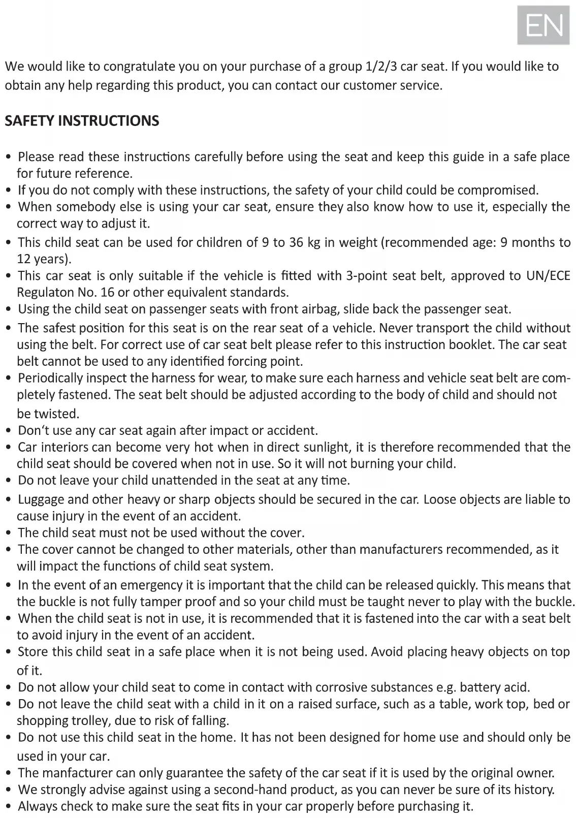 - The manfacturer can only guarantee the safety of the car seat if it is used by the original owner.