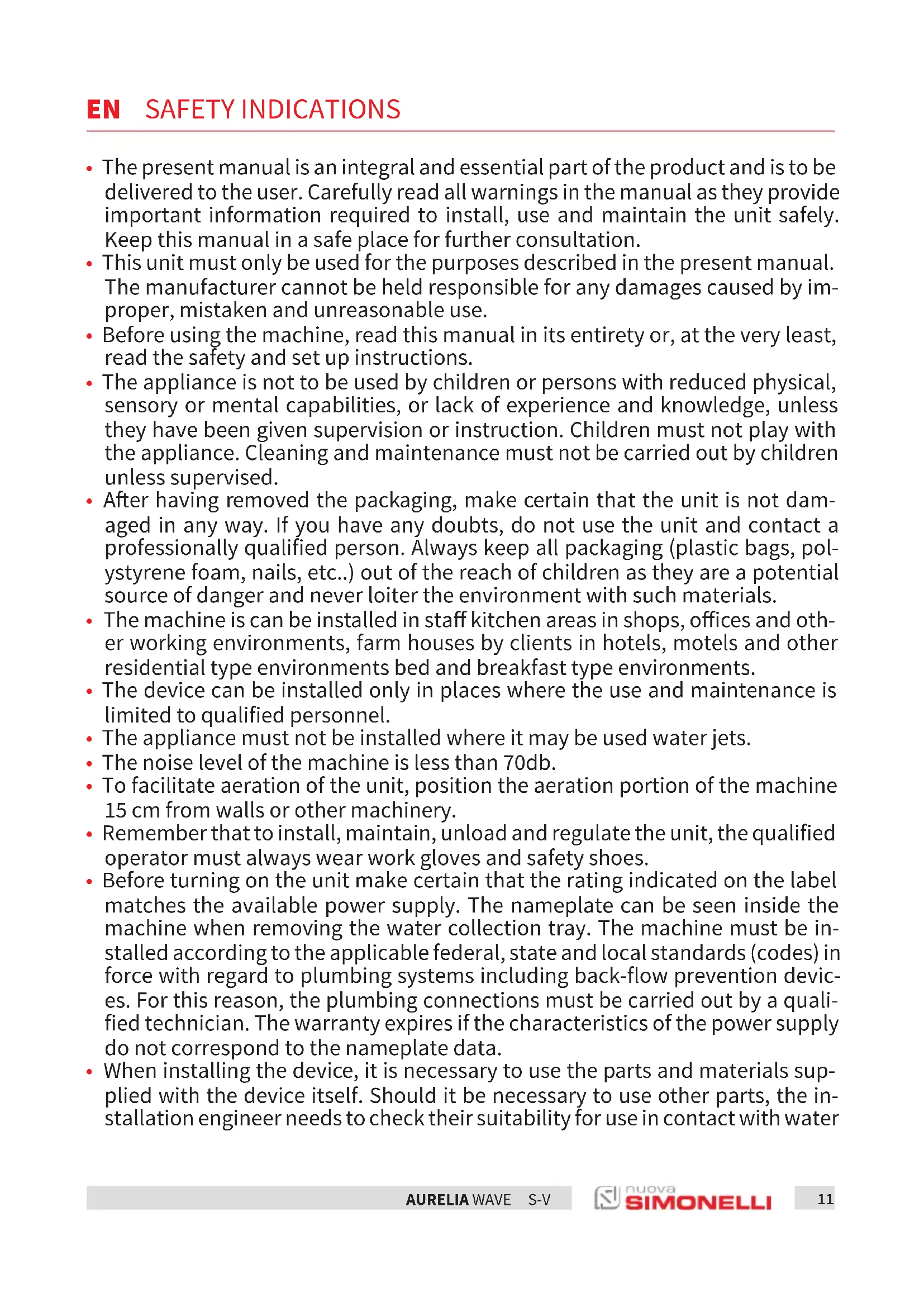 - It is forbidden to leave the machine switched on without the presence and sur- veillance of a qualified operator. Simonelli Group is not responsible for damag- es caused by failure to comply with this prohibition.