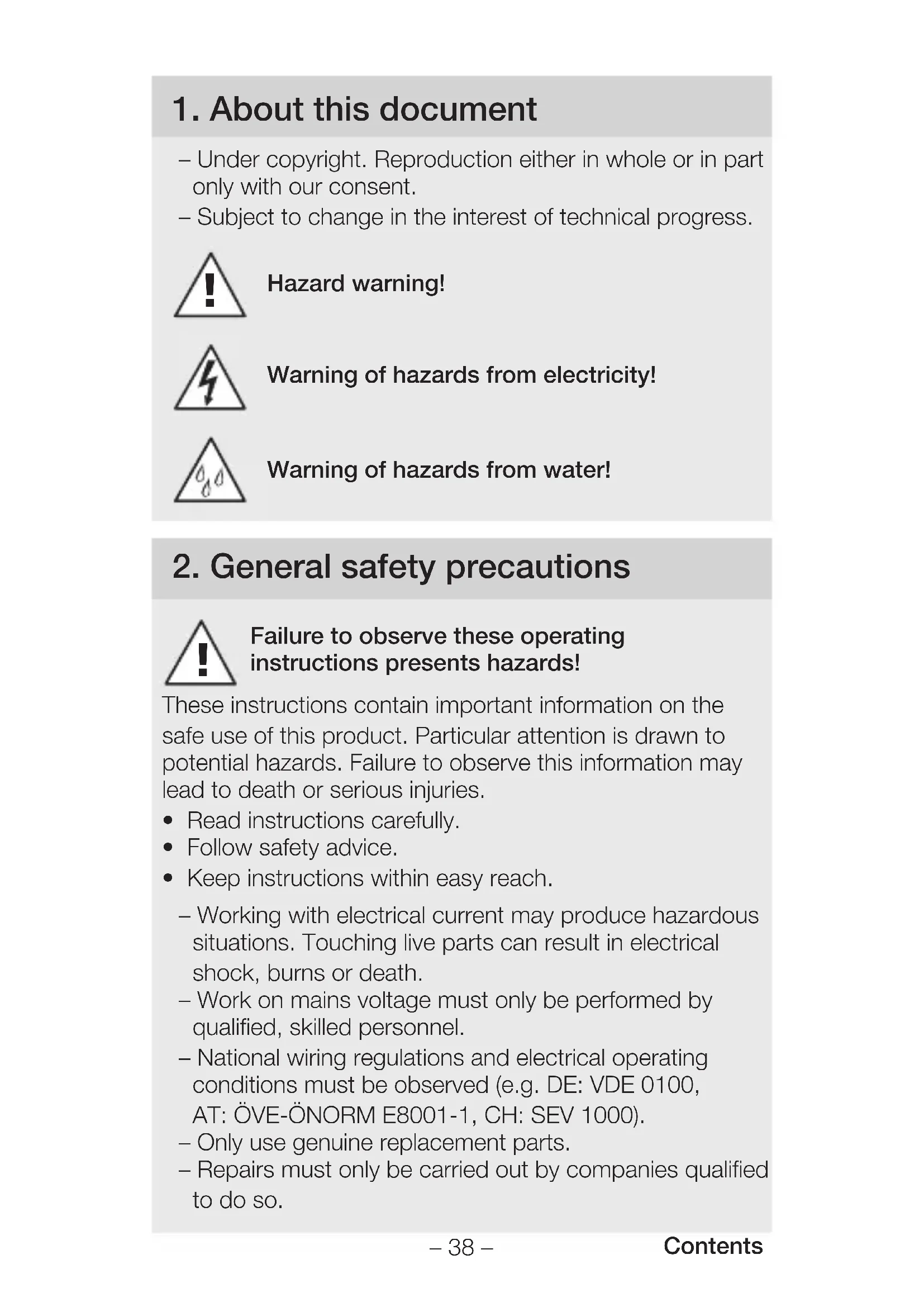 - Keep instructions within easy reach. – Working with electrical current may produce hazardous situations. Touching live parts can result in electrical shock, burns or death. – Work on mains voltage must only be performed by qualified, skilled personnel. – National wiring regulations and electrical operating conditions must be observed (e.g. DE: VDE 0100, AT: ÖVE-ÖNORM E8001-1, CH:SEV 1000). – Only use genuine replacement parts. – Repairs must only be carried out by companies qualified to do so.GB – 39 – Contents
