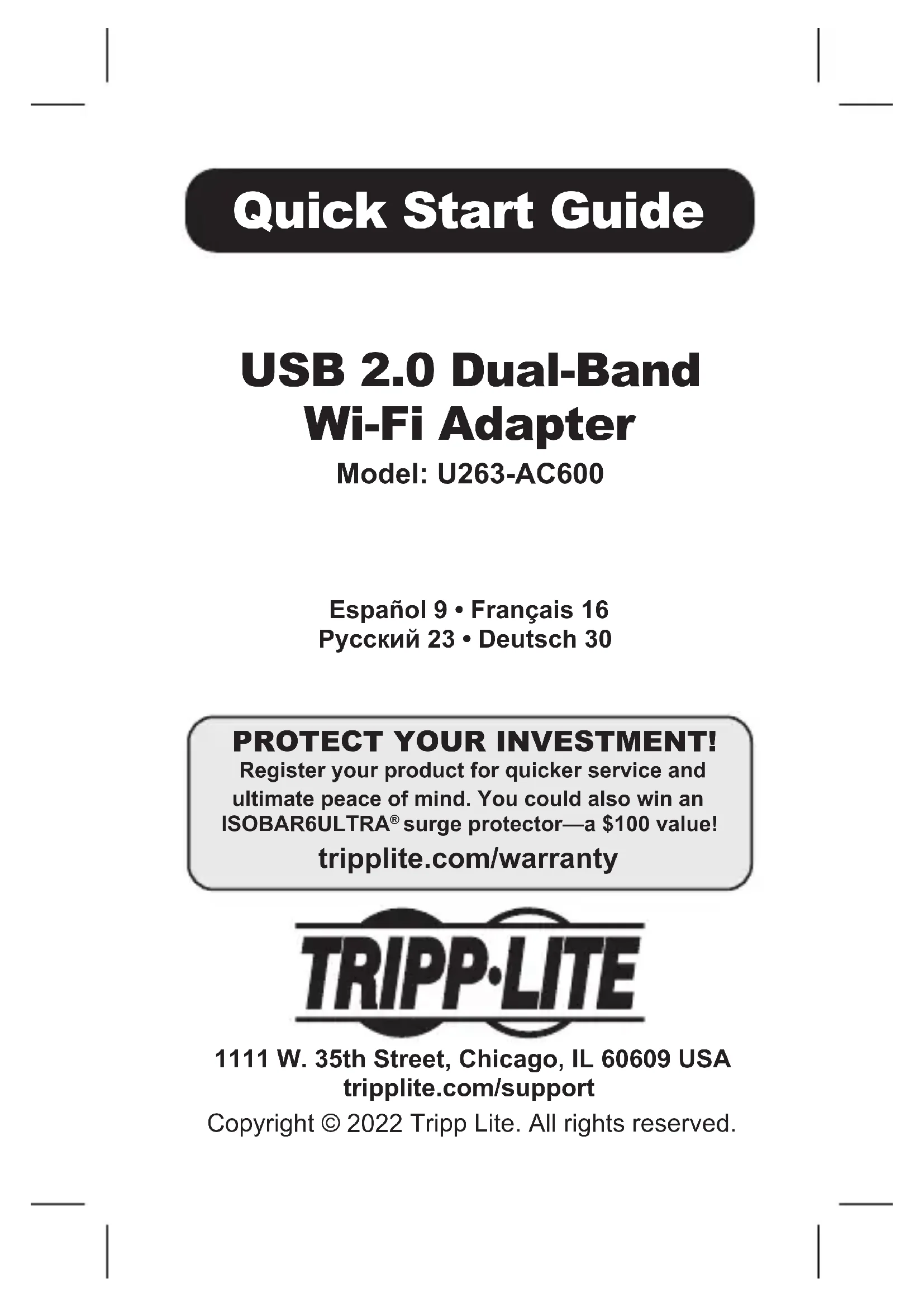 - Consult the dealer or an experienced radio/TV technician for help.8 Warranty and Product Registration Any changes or modications to this equipment not expressly approved by Tripp Lite could void the user’s authority to operate this equipment. Use of this equipment in life support applications where failure of this equipment can reasonably be expected to cause the failure of the life support equipment or to signicantly aect its safety or eectiveness is not recommended. Tripp Lite has a policy of continuous improvement. Specications are subject to change without notice. Photos and illustrations may dier slightly from actual products. 1111 W. 35th Street, Chicago, IL 60609 USA tripplite.com/support 22-01-388 93-3D2C_RevB9 Guía de Inicio Rápido Adaptador de Wi-Fi USB 2.0 de Doble Banda Modelo: U263-AC600 1111 W. 35th Street, Chicago, IL 60609, EE UU tripplite.com/support Copyright © 2022 Tripp Lite. Todos los derechos reservados. English 1 • Français 16 Русский 23 • Deutsch 3010 Características del Producto