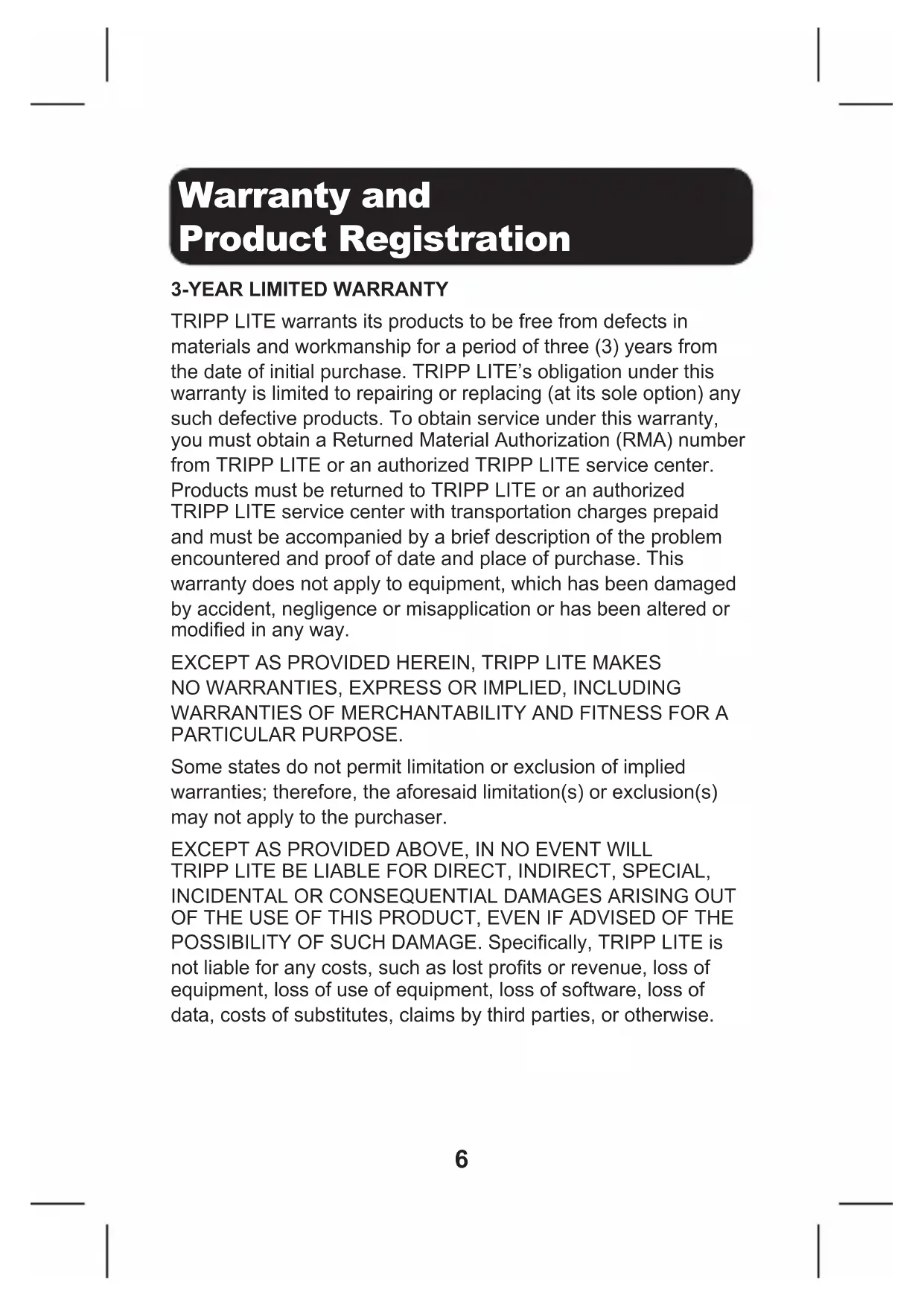 OF THE USE OF THIS PRODUCT, EVEN IF ADVISED OF THE POSSIBILITY OF SUCH DAMAGE. Specically, TRIPP LITE is not liable for any costs, such as lost prots or revenue, loss of equipment, loss of use of equipment, loss of software, loss of data, costs of substitutes, claims by third parties, or otherwise.7 Warranty and Product Registration PRODUCT REGISTRATION Visit tripplite.com/warranty today to register your new Tripp Lite product. You’ll be automatically entered into a drawing for a chance to win a FREE Tripp Lite product!*