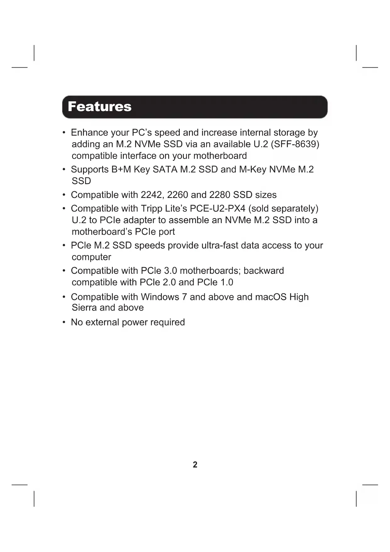 - Computer with an available U.2 port on its motherboard (or M.2 to U.2 adapter, such as Tripp Lite’s PCE-U2-PX4, sold separately. See tripplite.com for details.)