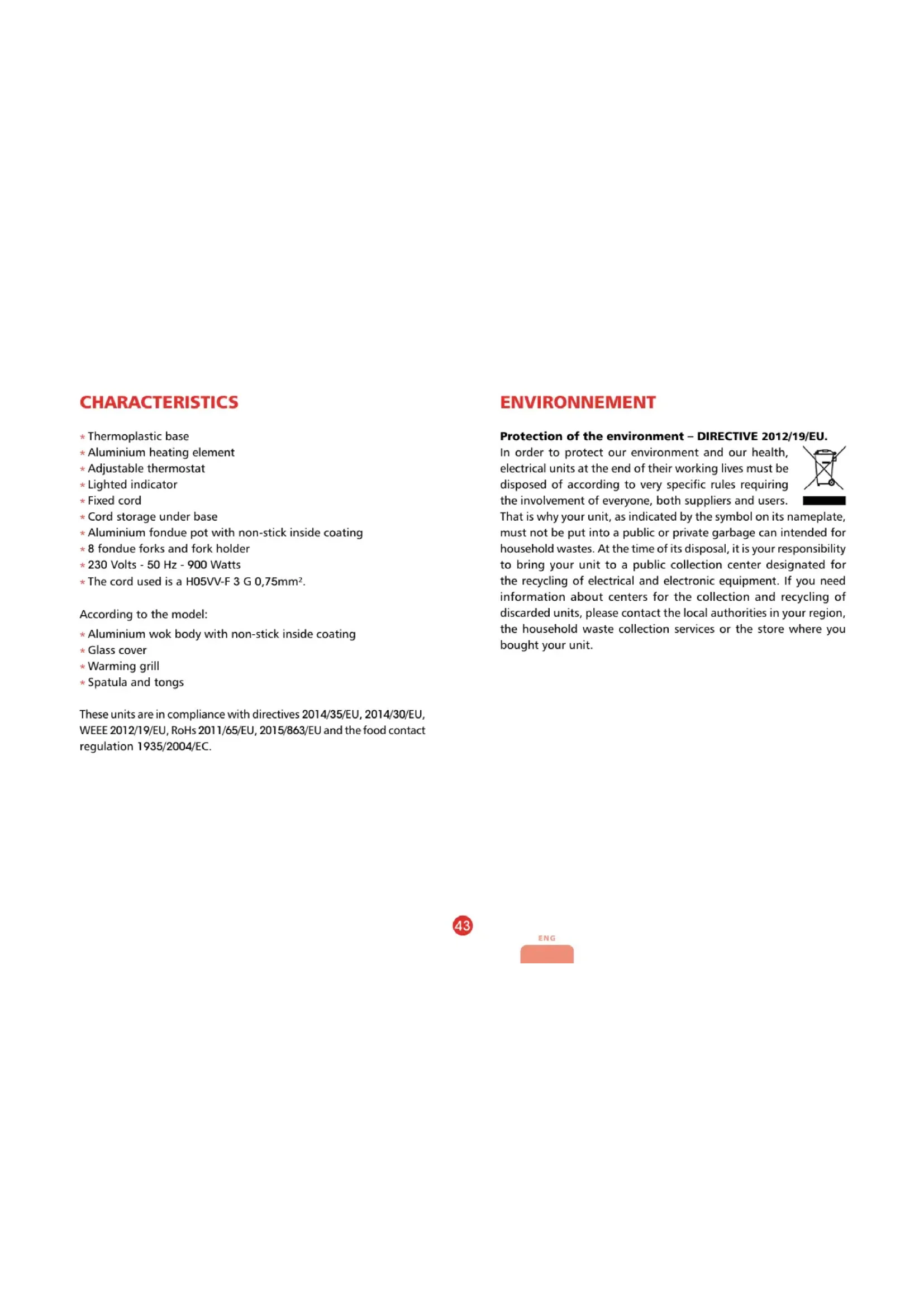 Spatula and tongs These units are in compliance with directives 2014/35/EU, 2014/30/EU, WEEE 2012/19/EU, RoHs 2011/65/EU, 2015/863/EU and the food contact regulation 1935/2004/EC. ENVIRONNEMENT Protection of the environment – DIRECTIVE 2012/19/EU. In order to protect our environment and our health, electrical units at the end of their working lives must be disposed of according to very specic rules requiring the involvement of everyone, both suppliers and users. That is why your unit, as indicated by the symbol on its nameplate, must not be put into a public or private garbage can intended for household wastes. At the time of its disposal, it is your responsibility to bring your unit to a public collection center designated for the recycling of electrical and electronic equipment. If you need information about centers for the collection and recycling of discarded units, please contact the local authorities in your region, the household waste collection services or the store where you bought your unit.