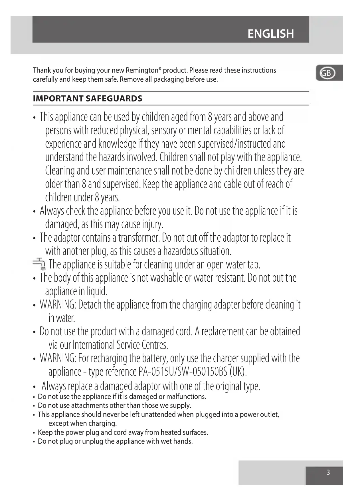 Thank you for buying your new Remington® product. Please read these instructions carefully and keep them safe. Remove all packaging before use. IMPORTANT SAFEGUARDS