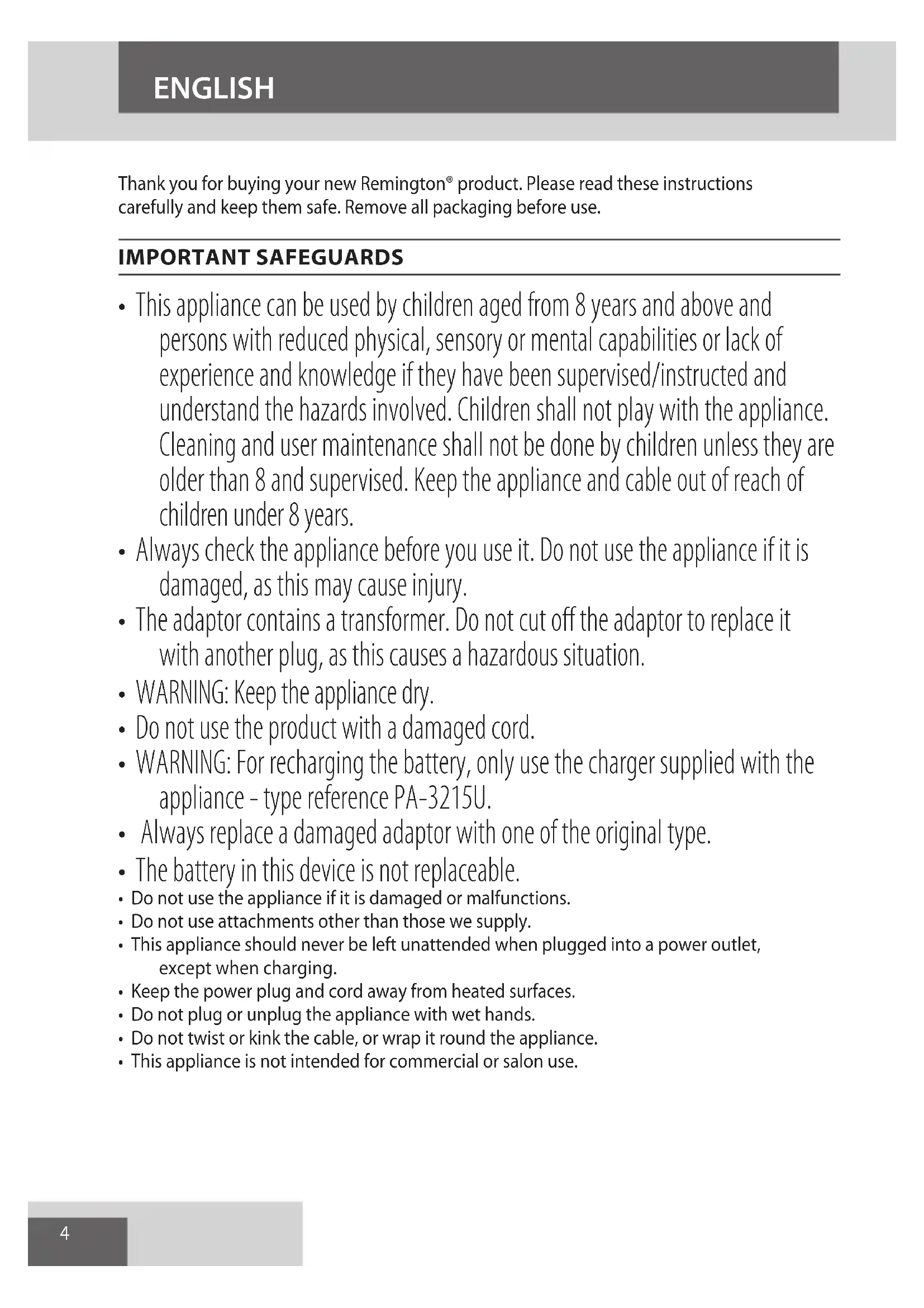 AE4 Thank you for buying your new Remington® product. Please read these instructions carefully and keep them safe. Remove all packaging before use. IMPORTANT SAFEGUARDS