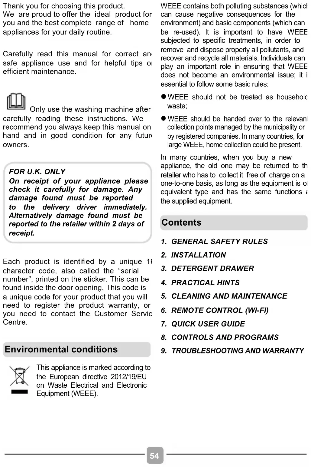 Thank you for choosing this product. We are proud to offer the ideal product for you and the best complete range of home appliances for your daily routine. Carefully read this manual for correct and safe appliance use and for helpful tips on efficient maintenance. Only use the washing machine after carefully reading these instructions. We recommend you always keep this manual on hand and in good condition for any future owners.