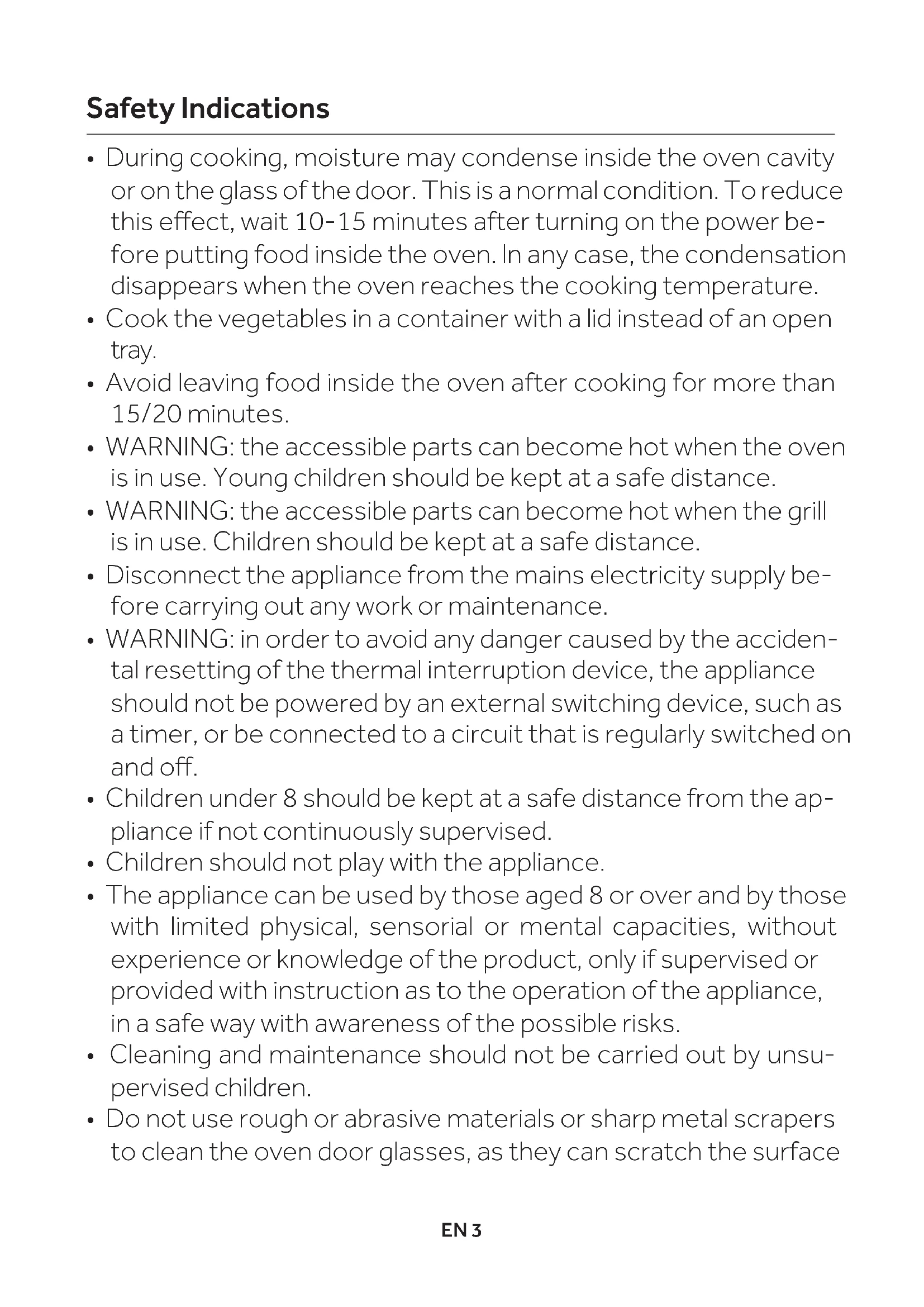 - Do not use rough or abrasive materials or sharp metal scrapers to clean the oven door glasses, as they can scratch the surface Safety IndicationsEN 4 and cause the glass to shatter.