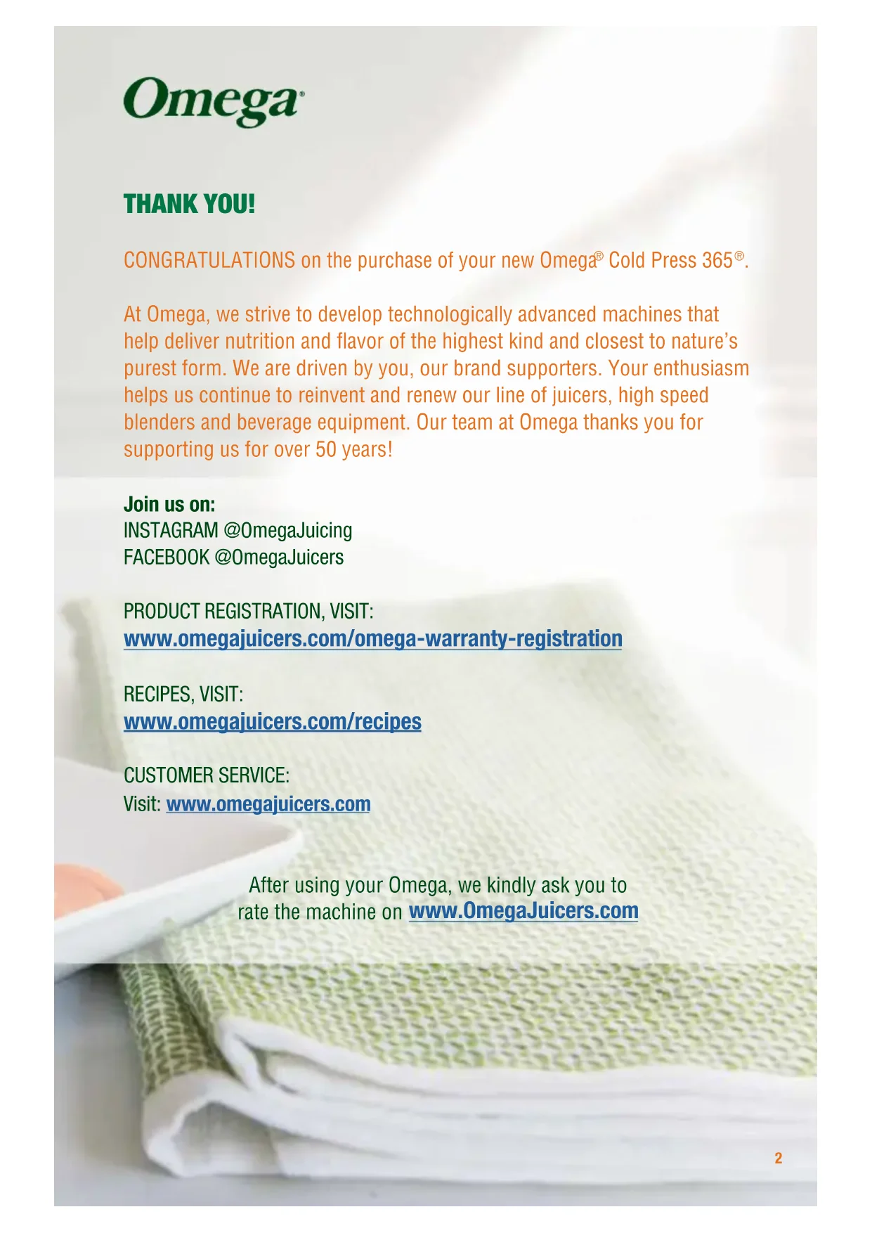 At Omega, we strive to develop technologically advanced machines that help deliver nutrition and flavor of the highest kind and closest to nature’s purest form. We are driven by you, our brand supporters. Your enthusiasm helps us continue to reinvent and renew our line of juicers, high speed blenders and beverage equipment. Our team at Omega thanks you for supporting us for over 50 years! Join us on: INSTAGRAM @OmegaJuicing FACEBOOK @OmegaJuicers PRODUCT REGISTRATION, VISIT: www.omegajuicers.com/omega-warranty-registration RECIPES, VISIT: www.omegajuicers.com/recipes CUSTOMER SERVICE: Visit: www.omegajuicers.com After using your Omega, we kindly ask you to rate the machine on www.OmegaJuicers.com3 IMPORTANT SAFEGUARDS