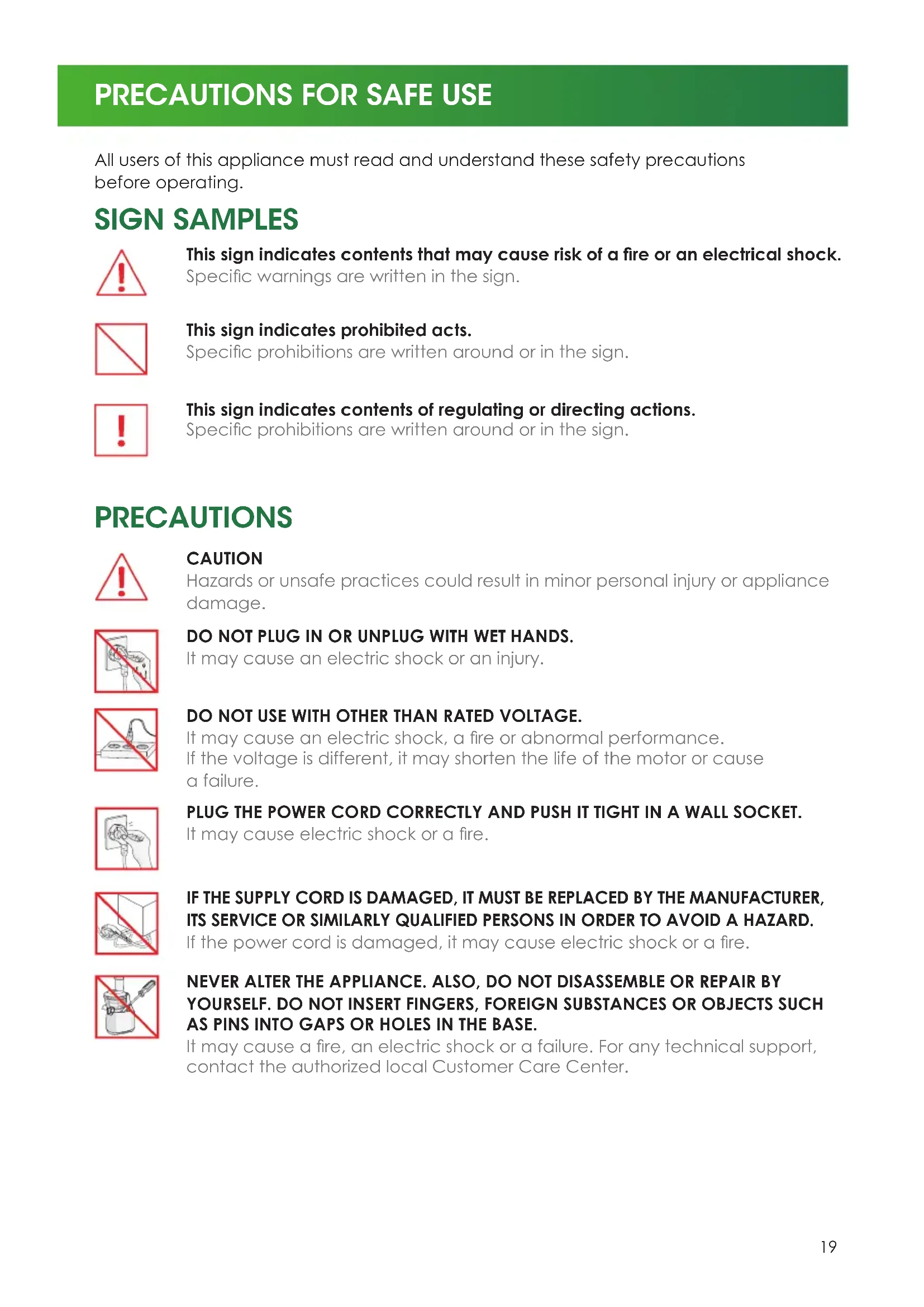 CAUTION Hazards or unsafe practices could result in minor personal injury or appliance damage. This sign indicates contents that may cause risk of a re or an electrical shock. Specic warnings are written in the sign. This sign indicates prohibited acts. Specic prohibitions are written around or in the sign. This sign indicates contents of regulating or directing actions. Specic prohibitions are written around or in the sign. DO NOT PLUG IN OR UNPLUG WITH WET HANDS. It may cause an electric shock or an injury. DO NOT USE WITH OTHER THAN RATED VOLTAGE. It may cause an electric shock, a re or abnormal performance. If the voltage is different, it may shorten the life of the motor or cause a failure. PLUG THE POWER CORD CORRECTLY AND PUSH IT TIGHT IN A WALL SOCKET. It may cause electric shock or a re. IF THE SUPPLY CORD IS DAMAGED, IT MUST BE REPLACED BY THE MANUFACTURER, ITS SERVICE OR SIMILARLY QUALIFIED PERSONS IN ORDER TO AVOID A HAZARD. If the power cord is damaged, it may cause electric shock or a re. NEVER ALTER THE APPLIANCE. ALSO, DO NOT DISASSEMBLE OR REPAIR BY YOURSELF. DO NOT INSERT FINGERS, FOREIGN SUBSTANCES OR OBJECTS SUCH AS PINS INTO GAPS OR HOLES IN THE BASE. It may cause a re, an electric shock or a failure. For any technical support, contact the authorized local Customer Care Center. All users of this appliance must read and understand these safety precautions before operating. SIGN SAMPLES PRECAUTIONS20