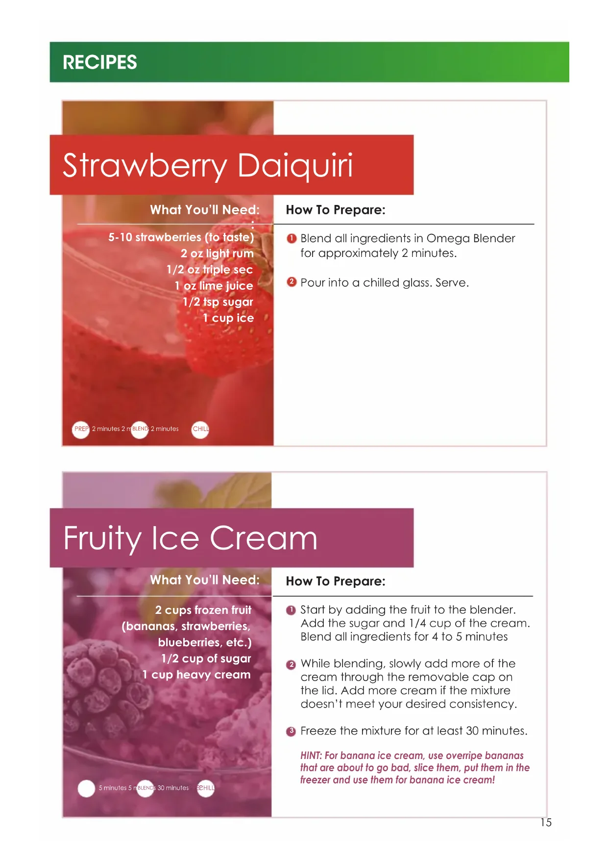 2 cups frozen fruit (bananas, strawberries, blueberries, etc.) 1/2 cup of sugar 1 cup heavy cream Start by adding the fruit to the blender. Add the sugar and 1/4 cup of the cream. Blend all ingredients for 4 to 5 minutes While blending, slowly add more of the cream through the removable cap on the lid. Add more cream if the mixture doesn’t meet your desired consistency. Freeze the mixture for at least 30 minutes. HINT: For banana ice cream, use overripe bananas that are about to go bad, slice them, put them in the freezer and use them for banana ice cream! Strawberry Daiquiri Fruity Ice Cream What You’ll Need: How To Prepare: What You’ll Need: How To Prepare: