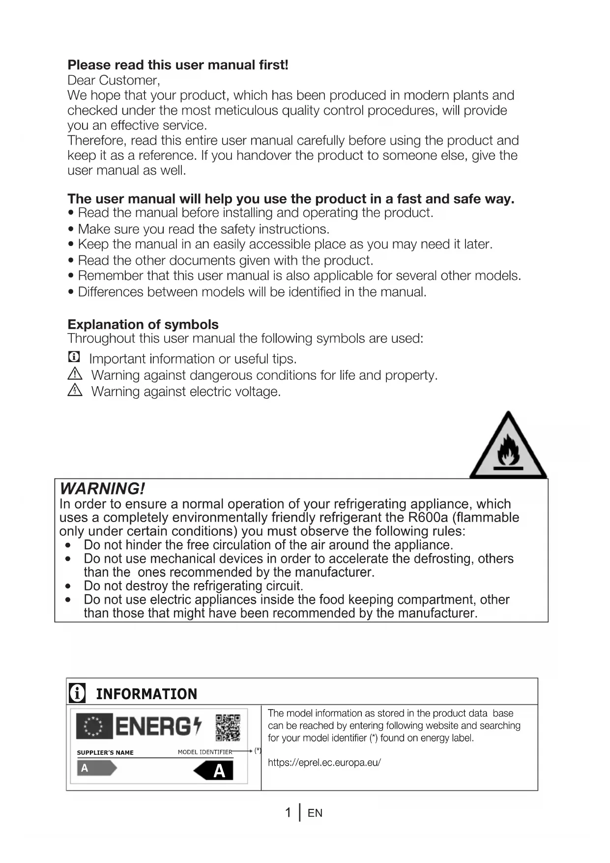 In order to ensure a normal operation of your refrigerating appliance, which uses a completely environmentally friendly refrigerant the R600a (flammable only under certain conditions) you must observe the following rules: