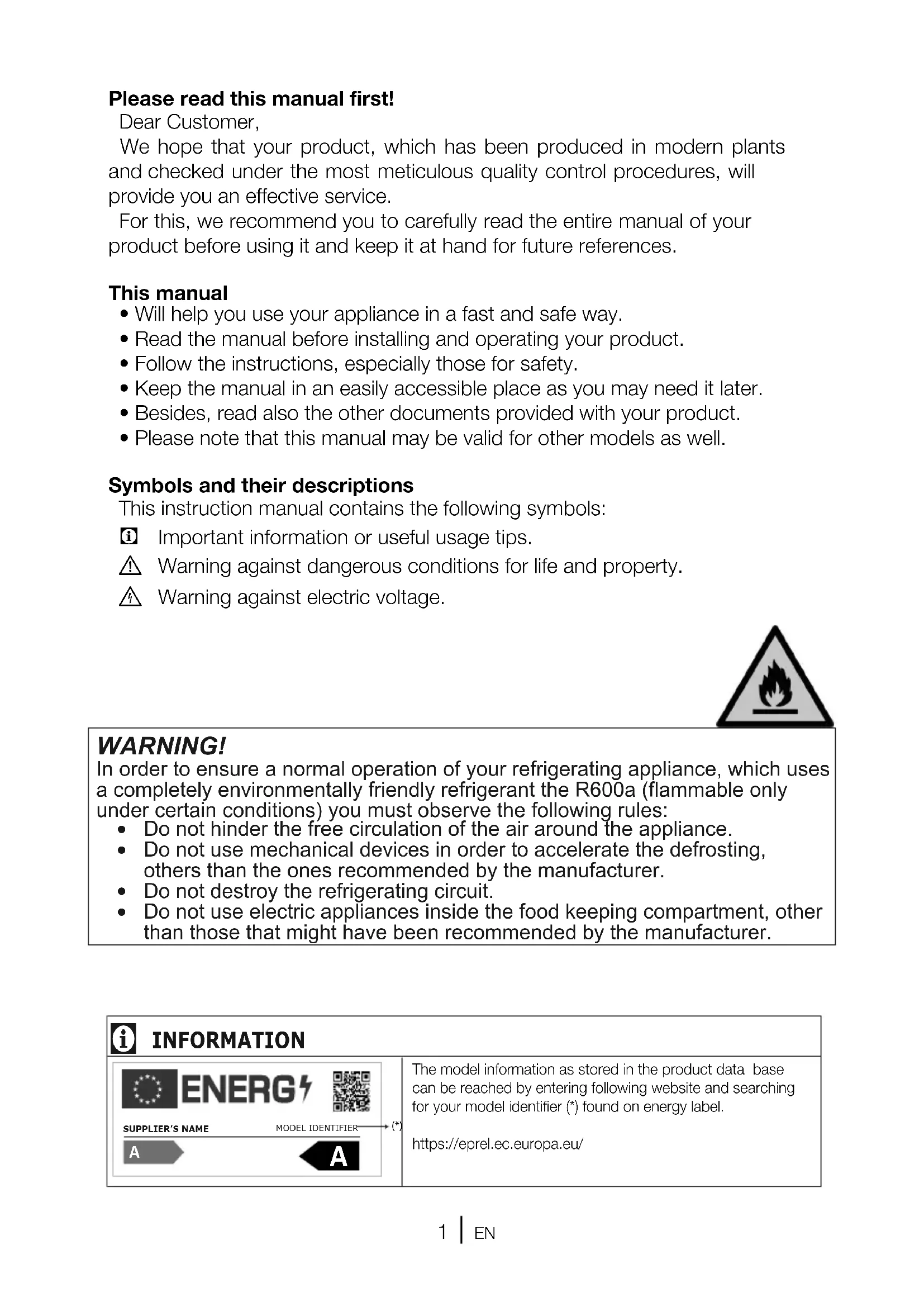 Warning against electric voltage. WARNING! In order to ensure a normal operation of your refrigerating appliance, which uses a completely environmentally friendly refrigerant the R600a (flammable only under certain conditions) you must observe the following rules: