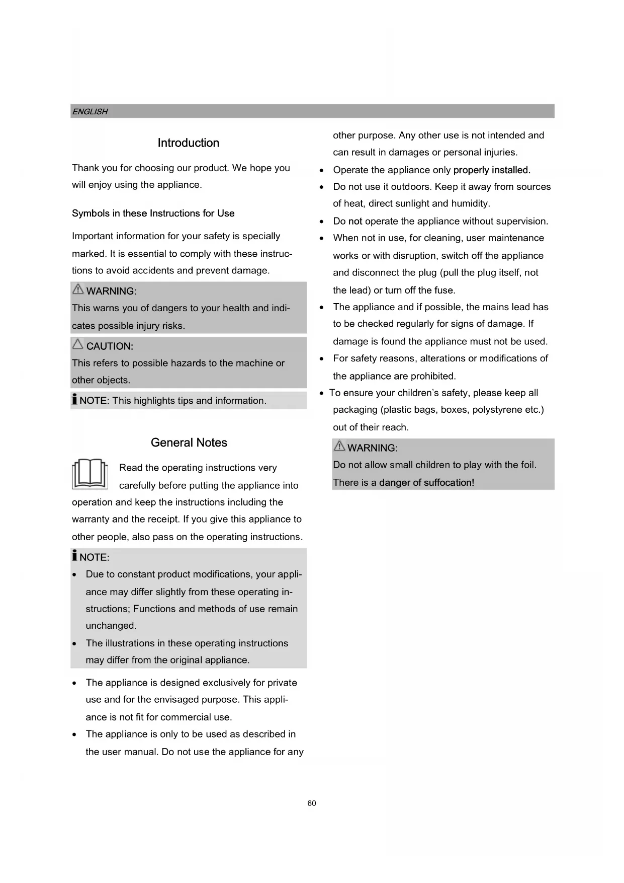 ENGLISH Introduction Thank you for choosing our product. We hope you will enjoy using the appliance. Symbols in these Instructions for Use Important information for your safety is specially marked. It is essential to comply with these instruc- tions to avoid accidents and prevent damage.