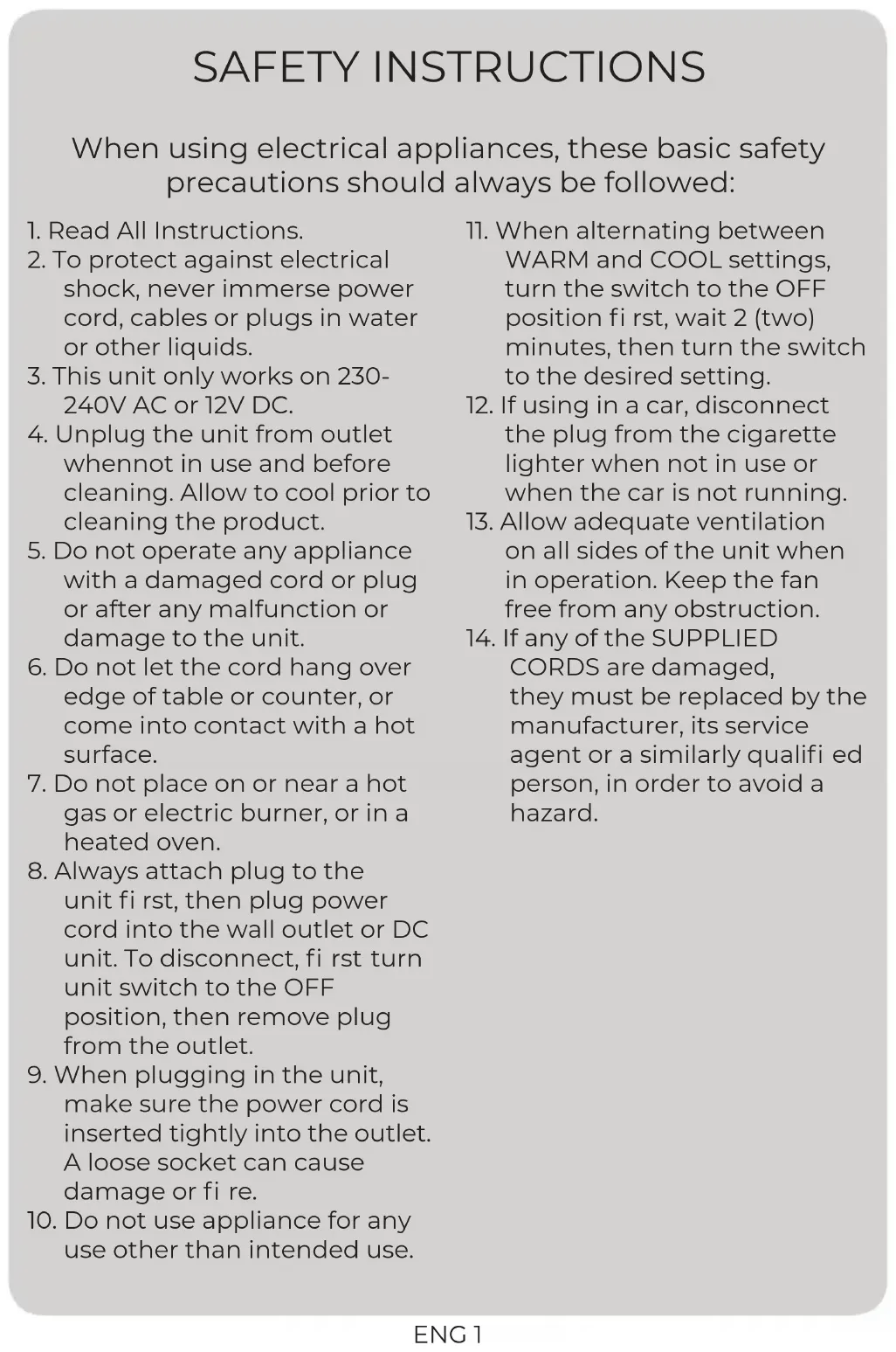 12ENG 4 Operating Instructions Unit Placement Locate unit a minimum of 3” (7.6cm) from wall or structure to allow proper ventilation to the back and top of the unit. Plugging in your Unit FOR HOME USE: Insert the AC power cord provided, by first inserting the AC power cord into the АС-in port, and then plugging into an AC wall outlet. NOTE: This unit only works on 230-240V. FOR MOBILE USE: insert the DC power cord into the DC-in port. In a car, RV, or boat, make sure the motor is on before plugging the DC power cord into the 12V cigarette lighter/DC outlet. Do not use DC power when motor is turned off. Turning on your Unit FOR COOLING: Flip the power switch from OFF to COOL setting. A green light will indicate that the unit is in cooling mode. FOR WARMING: Flip the power switch from OFF to WARM setting. A red light will indicate that the unit is in warming mode. IMPORTANT: Before plugging in the unit, make sure the switch on the back of the unit is in the OFF position.ENG 5 Confi guring the Interior of Your Unit